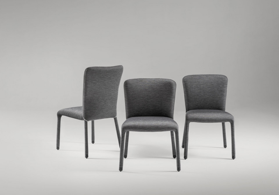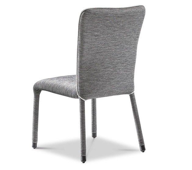 Light and dynamic, it is characterized by a continuous and harmonious line, which elegantly unites all its parts. Sinuously defined curves characterize the entire design. The backrest has a delicately enveloping shape, which widens at the top, to offer adequate support to the back and shoulders. The seat, also ergonomic, bends forward to smoothly join the legs, avoiding sharp edges and corners. An aesthetic quirk, and a connotating detail, is the external seam of the backrest upholstery. The piping follows the upper profile of the shell and runs sideways to embrace the leg, adding a sophisticated touch.