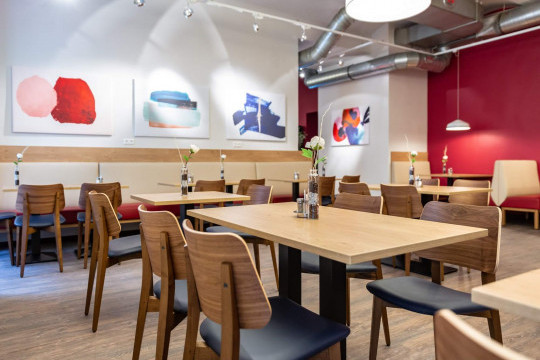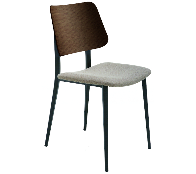 Chair with wooden four leg frame, available in different finishes. Seat and backrest upholstered with hide or regenerated hide.