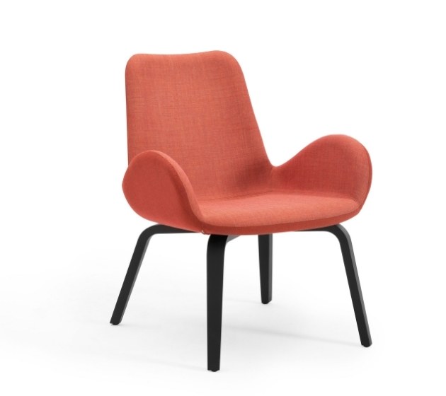 Dalia lounge armchair on restle with metal swivel base. Seating upholstered in fabric, leather or faux leather.