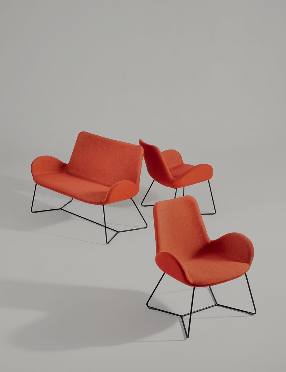 Dalia lounge armchair on restle with metal swivel base. Seating upholstered in fabric, leather or faux leather.