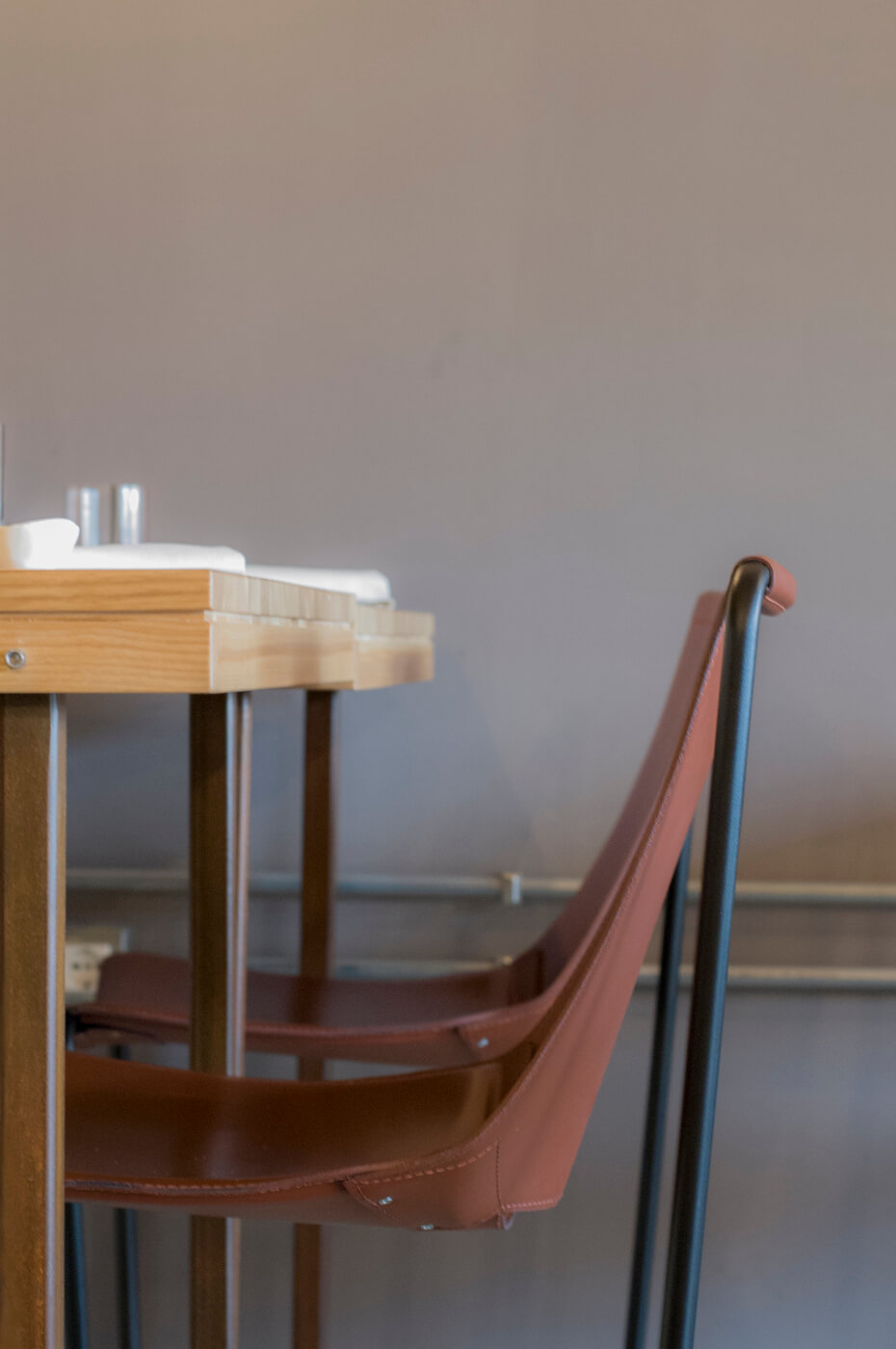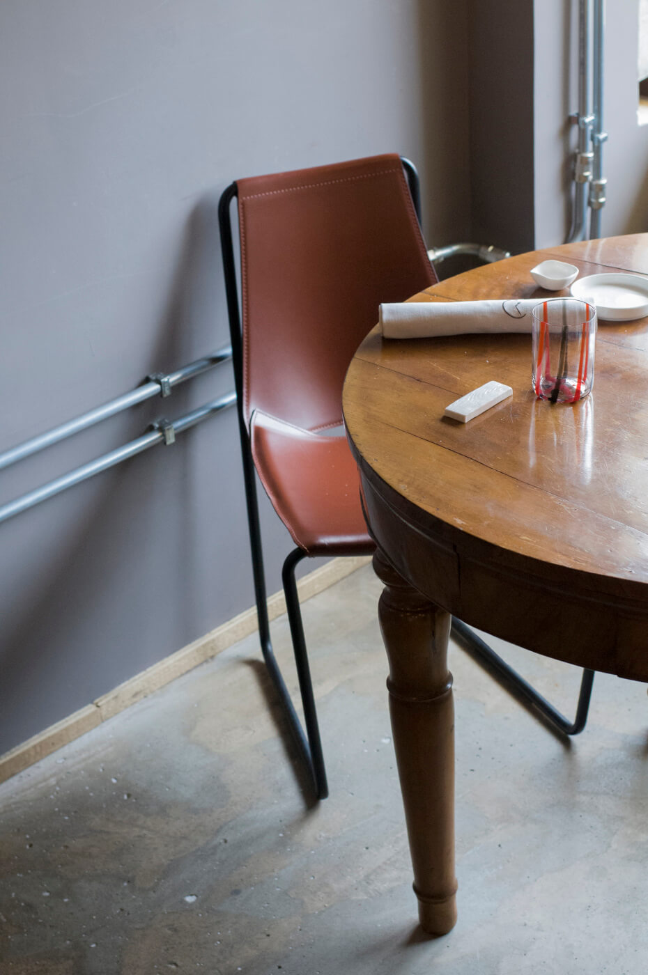 Apelle chair with sled base in lacquered steel. Seat and backrest in hide or tuscan hide.