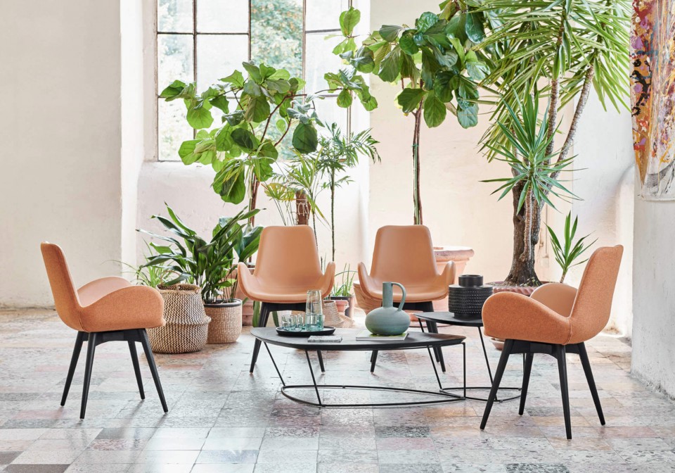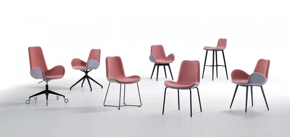 Dalia armchair with low backrest and wooden base. Seat upholstered in fabric, leather or faux leather.