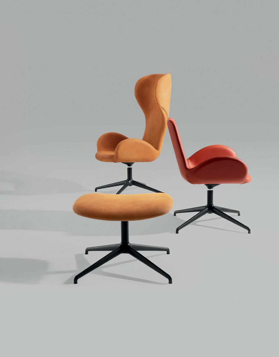 Dalia lounge armchair with high backrest and metal swivel trestle base. Seating is available upholstered in leather, faux leather and fabric. Back and front of backest customizable with different materials and colors.