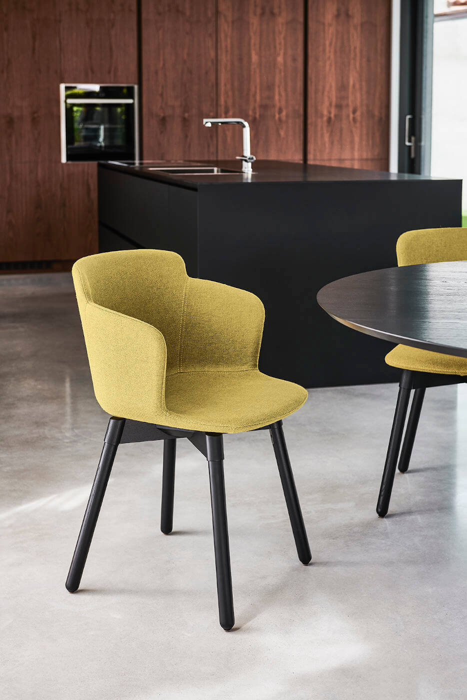 Armchair with four-legs wooden base. Polypropylene shell. Optional: fabric, leather or faux leather cushion.