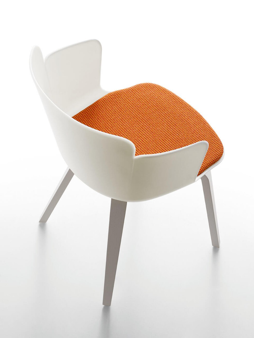 Armchair with four-legs wooden base. Polypropylene shell. Optional: fabric, leather or faux leather cushion.