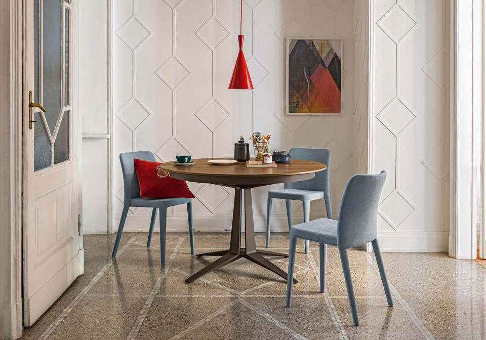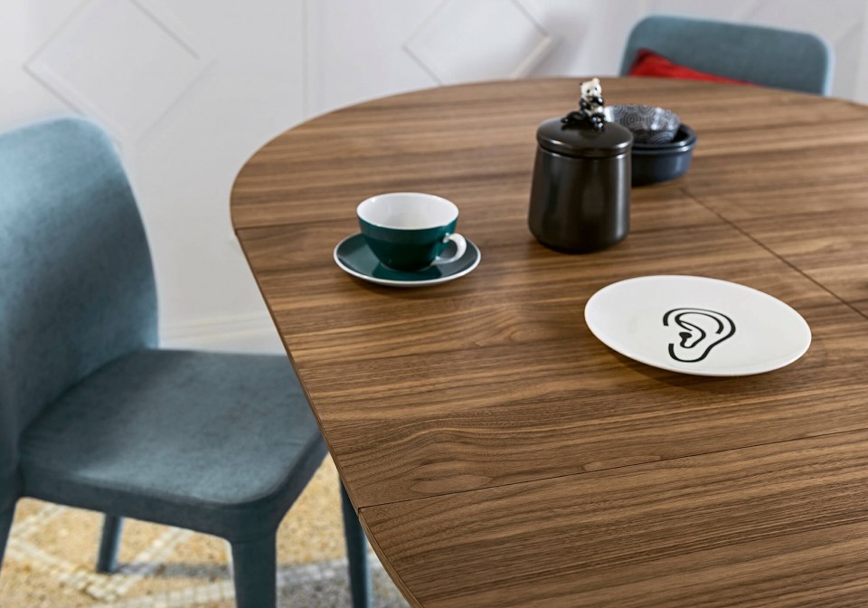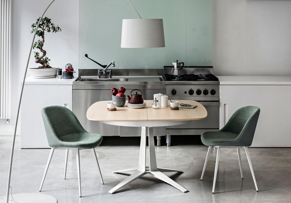Link extendable table features elegant curves and a solid four-star base.