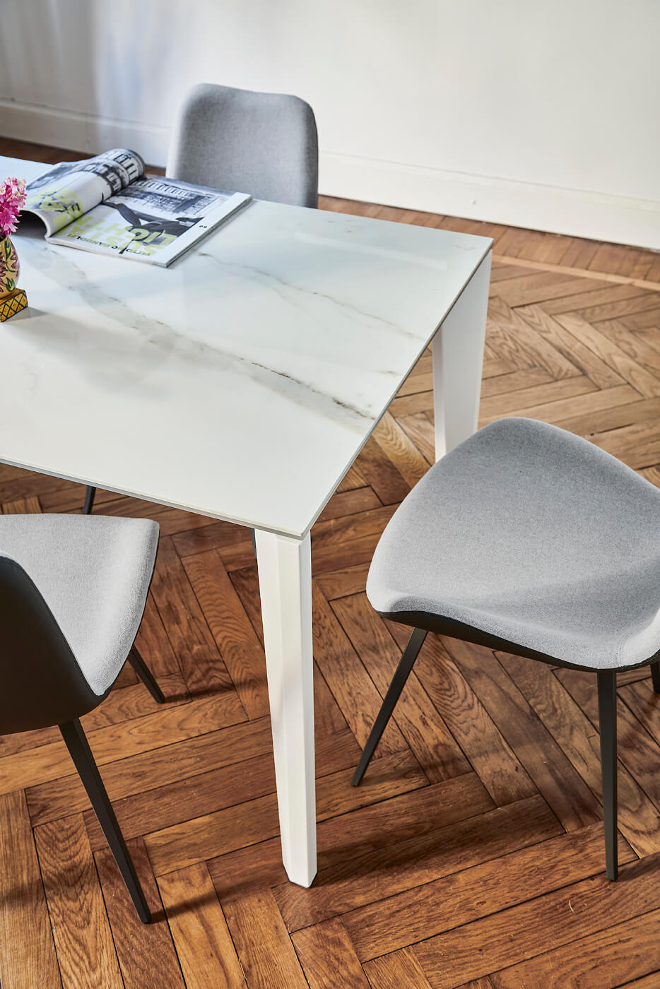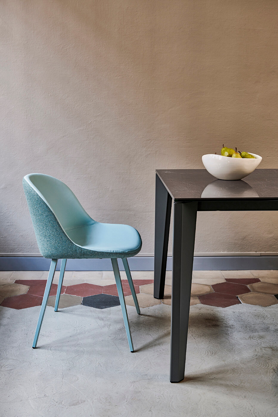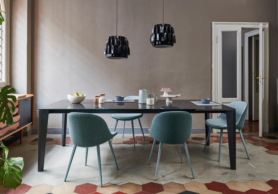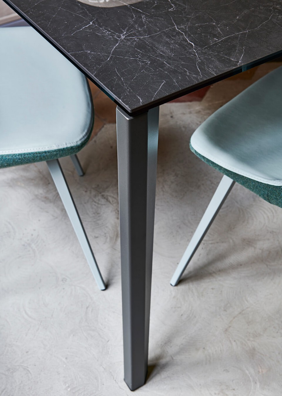 Frame in lacquered metal. Top in melamine, laquered MDF, glass, anti-scratch glass and crystalceramic.