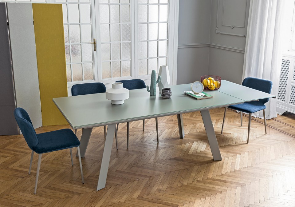 Alexander extendable table with four leg base in lacquered metal.