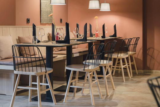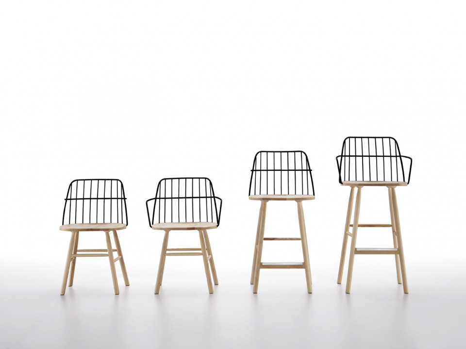 Strike chair with wooden frame and backrest in lacquered metal.