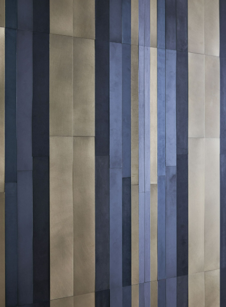 Rivestimento per pareti ispirato alle cancellate degli storici palazzi di Milano anni ’30. Un disegno continuo, adattabile a qualsiasi dimensione, ideale per hotels, boutique e in generale i grandi ingressi. Il rivestimento lavora su piani differenti, per enfatizzarne le forme e sottolineare il decoro.