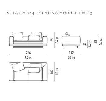 With its geometric rigour, the base creates an original contrast with the softness of the seat, conceived as a single cushion punctuated by light stitching defining the width of the seat - 83 or 68 cm - and with the structure of the backrest and armrest, covered in channelled goose down padding. The backrest and armrest form a single volume, with a 45° split in the corner.