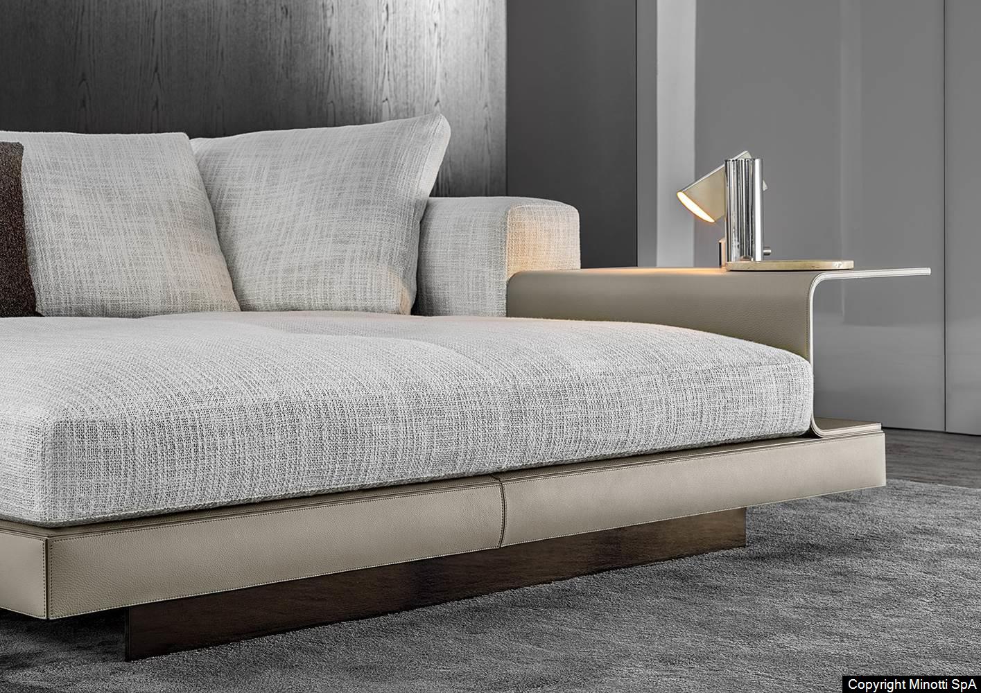 The structural base is raised from the ground on thin blades in extruded aluminium in a Brandy polished varnished finish, positioned at the front, giving the sofa an appealing and airy look, and recalling the metal parts of trunks and suitcases.