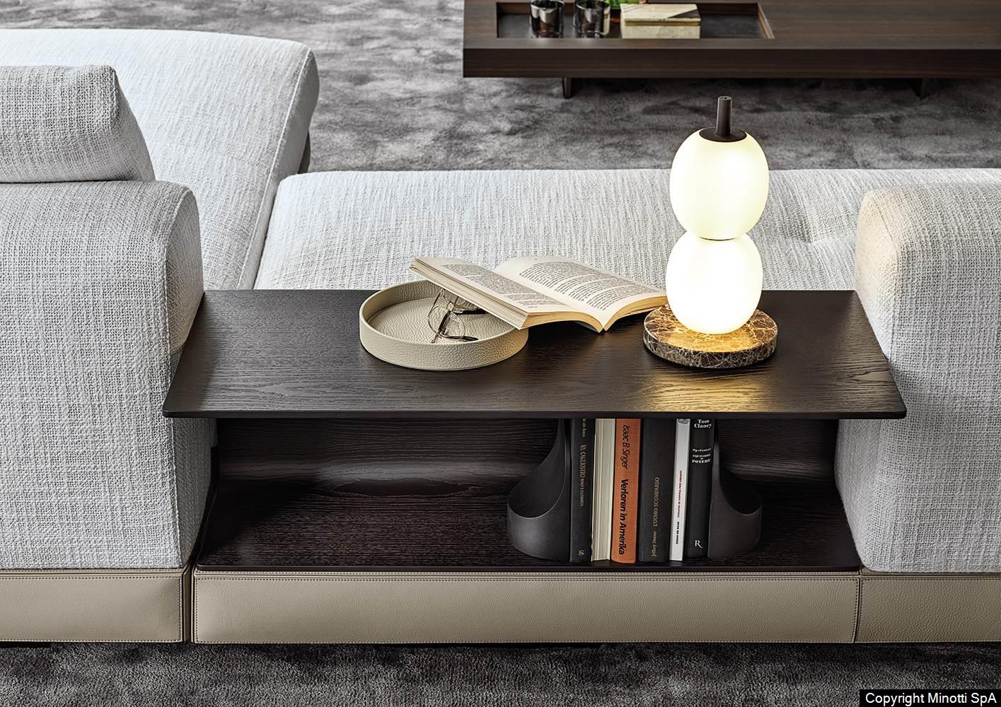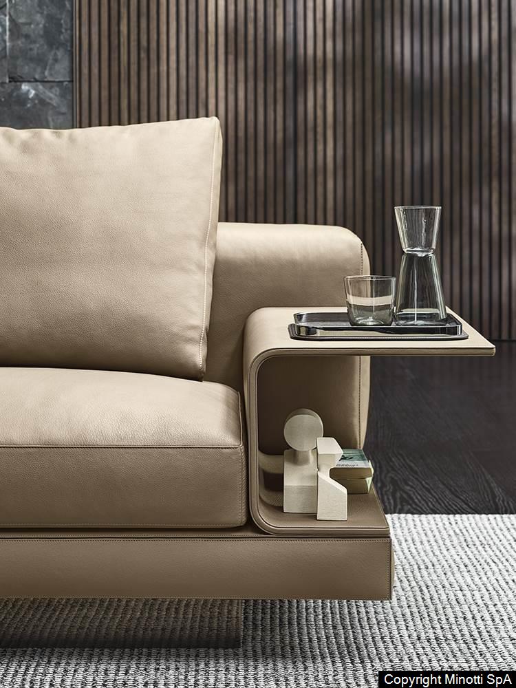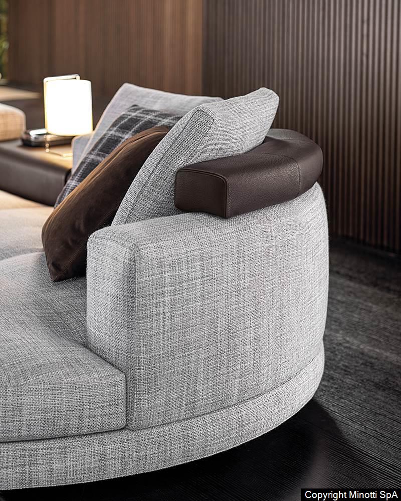 As well as the fabric covering, the padded structural base can also feature a covering with strips of leather, crafted with the same technique used in fine leather luggage-making. References to the concept of high-end leather goods are also found in the headrests and the elegant “C”-shaped Flap surfaces, which seamlessly blend into the seating elements, animating the compositions with a vibrant rhythm.
