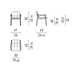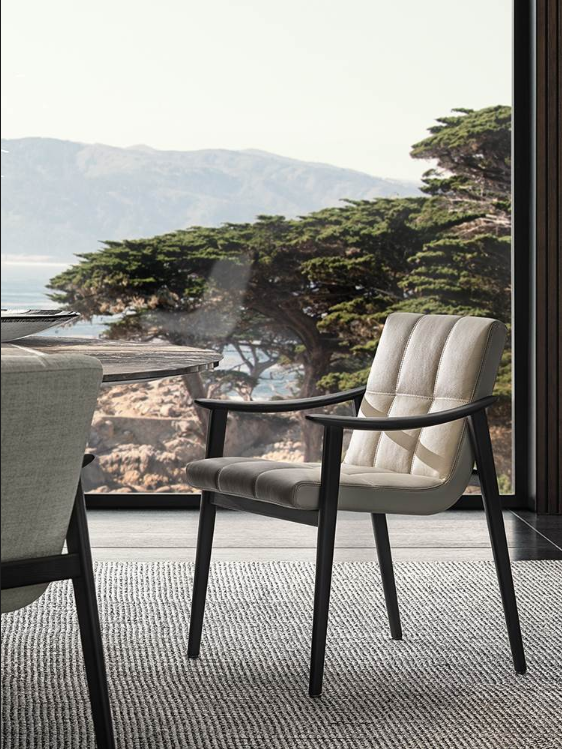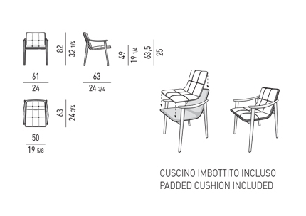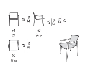 The Fynn armchair and little armchairs feature an ultra-lightweight aesthetic with a minimal frame in ash wood with Liquorice colour stained finish. This hosts a padded seat and backrest cushion, designed as a single element. The informal rigour with which Fynn hosts the upholstered element designs a comfortable seat that almost cradles the body, wrapping it in the warmth of the wooden structure.