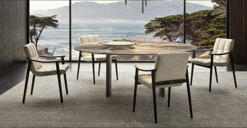The signature element of the Fynn seats is the armrest, elongated and slightly curved, rounded and smooth to the touch, 100% handmade. Its precise, well-defined line identifies the whole family of seats, in the two Fynn and Fynn Saddle-Hide versions. Covered with the exclusive fabrics and saddle-hides in the collection, it fully expresses the high level of the elegant sartorial process which has always been Minotti’s distinguishing mark.