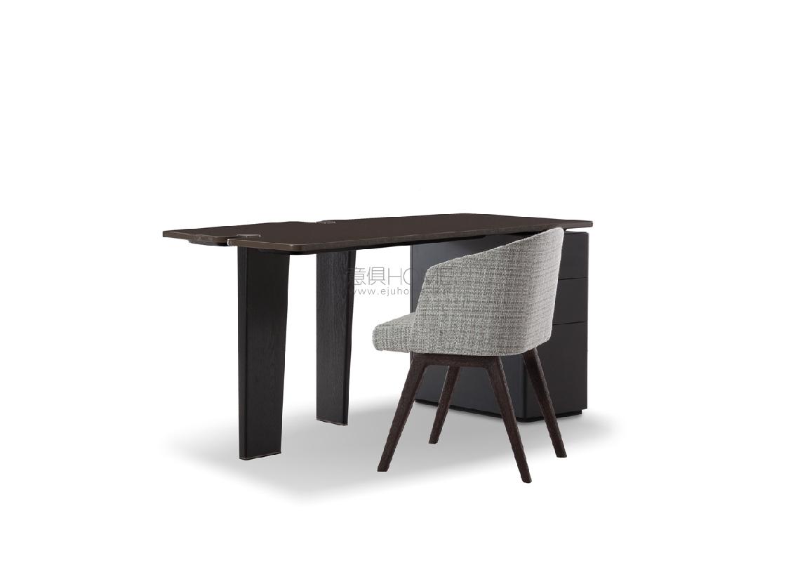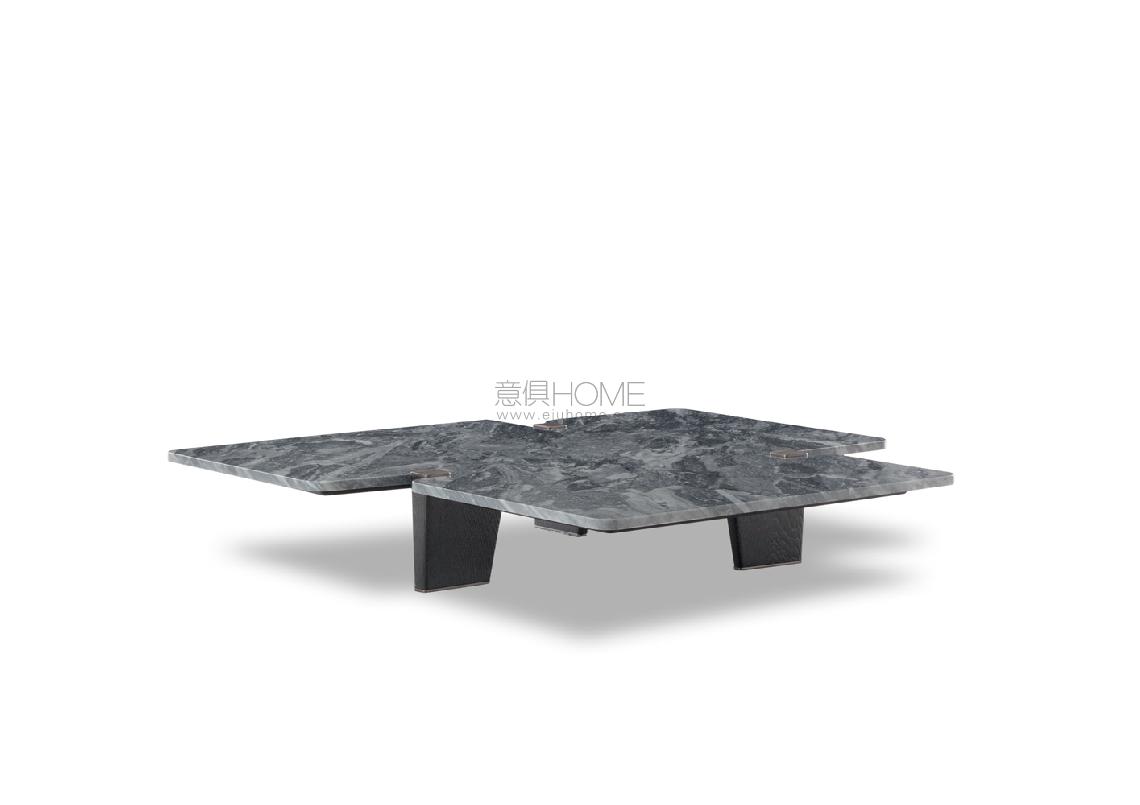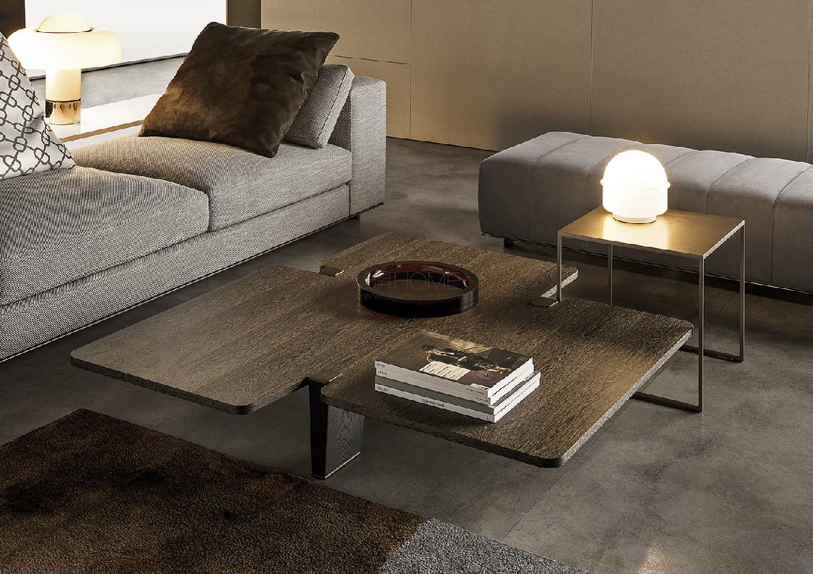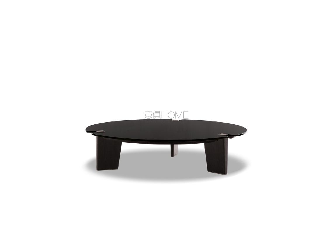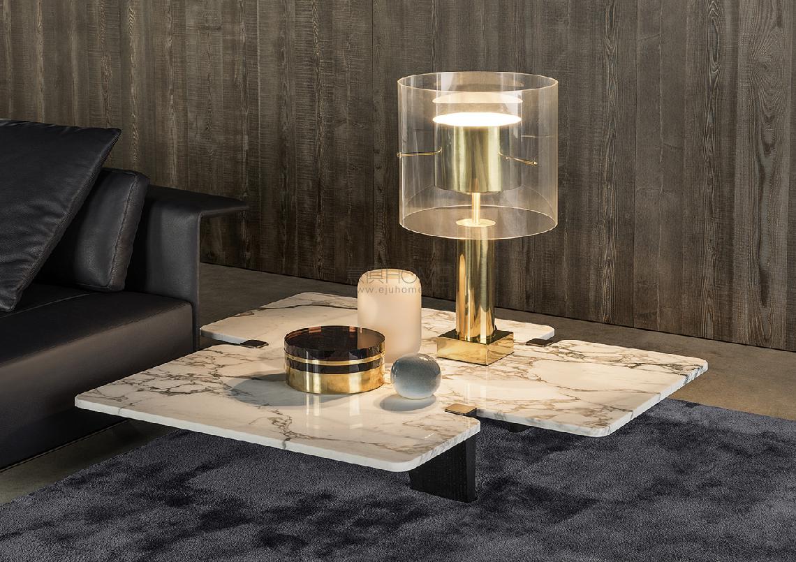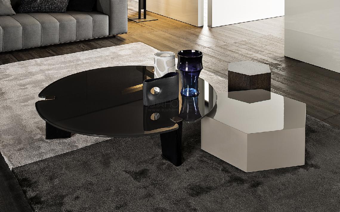 Table tops in uncommon shapes rest on solid brushed oak legs with painted black finish. The bronzed metal cap that rests on the floor and the plate with the same finish located at the upper end of the leg are details that add a touch of refinement to accessories with an already bold personality. The many finishes available for the table top reflect the enchantment of different materials: from the natural effect of Sucupira veneer with stained Mink finish, to the more sophisticated Calacatta or Bardiglio Nuvolato marble, to the modern sheen of the glossy lacquered Sand or Mud finish. The table with round top comes in Sucupira veneer with stained Mink finish and in backpainted glass in the following colors: Teal, Granite and Sand.