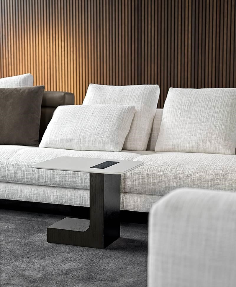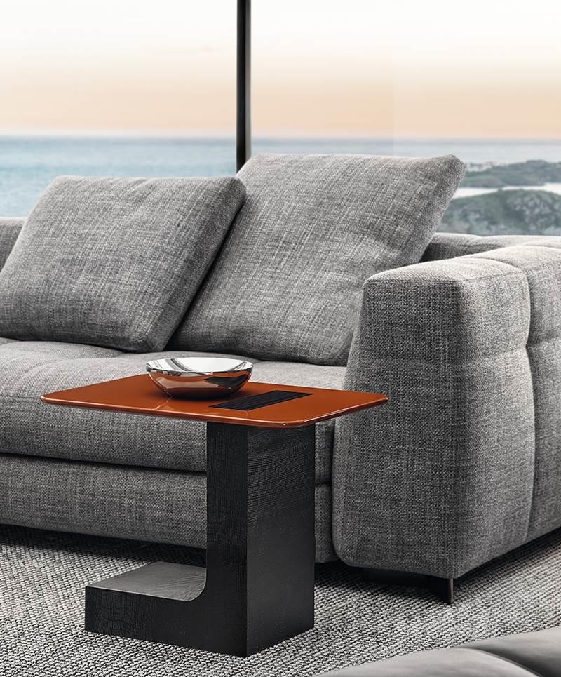 Visually, the top has a sculptural feel, sporting smoothed edges like a river stone, a tactile and a shiny lacquered finish in a colour palette ranging from White to Rust and Moka.