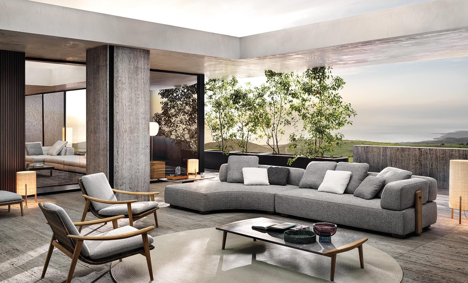 Characterised by an interwoven frame that hosts soft seat and backrest cushions, Fynn has in the armrest its signature element.