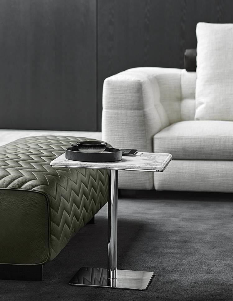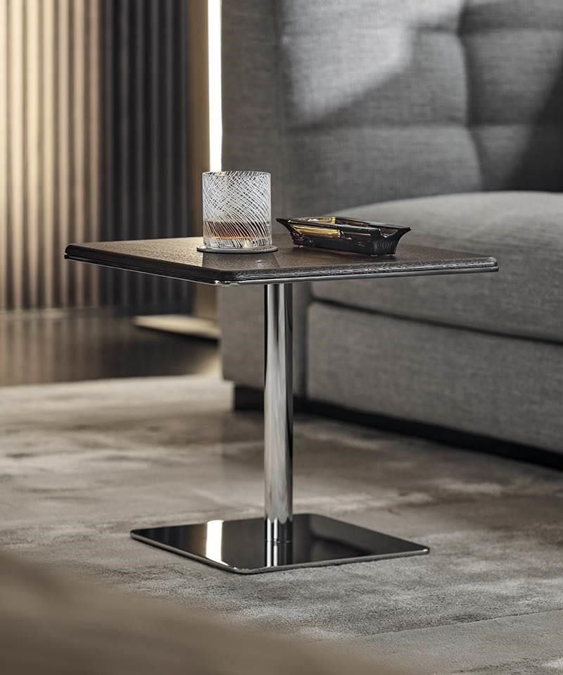 With its Modernist minimal design and use of materials, the Kyle coffee table has a metal frame, with chrome finish, which accommodates a square top with rounded corners and smooth edges. Texture is the distinguishing feature of the wooden top in brushed oak with Moka lacquer finish; on the other hand, luxury characterises the version in Calacatta marble. Kyle is available in two heights to better fulfil the requirements of its role as valuable side table set alongside armchairs and sofas.