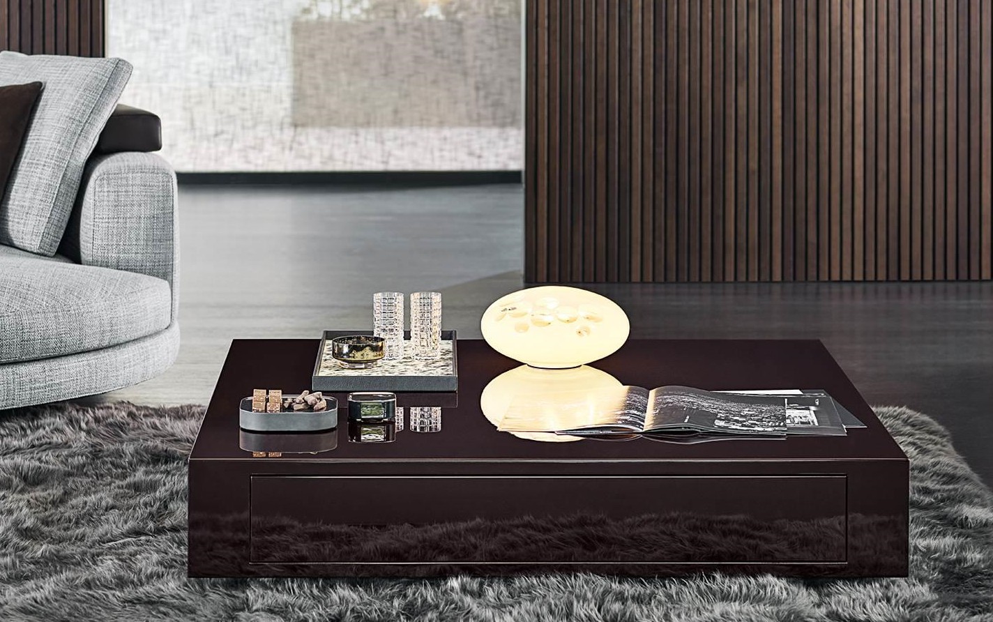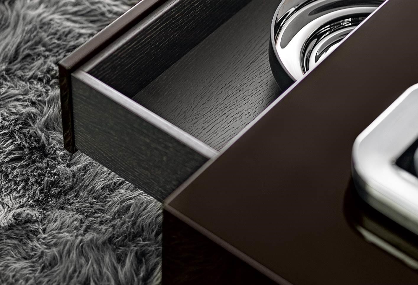 The Solid coffee tables, in all sizes, are available both in the glossy lacquered version in the colours Corten, Muschio, Petrolio and Moka and in the open-pore ash finish in Moka colour. Some of them are useful storage elements thanks to drawers, with interior in Moka-coloured ash and push & pull opening, almost imperceptible by the eye thanks to their perfect aesthetics.