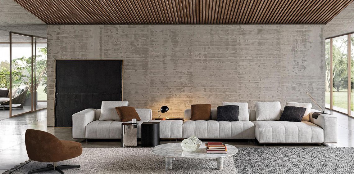 With a clear 1970s imprint, the inspiration behind this design is the graphic character of those years, its ability to stratify and cross marks, reducing the complexity of things into a few distinctive features. In this way, in Goodman the mark of the matelassé stitching, typical of Minotti's tailoring processes, draws shadows and light on the seat, creating the sensation of a quilted cross-padding.