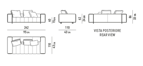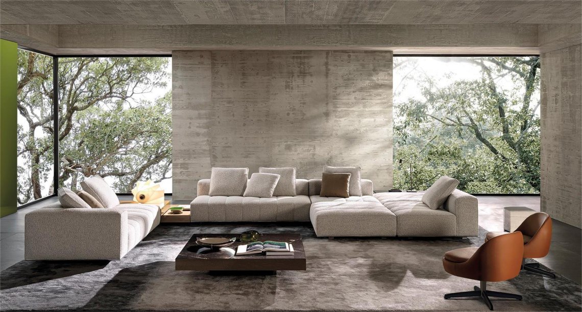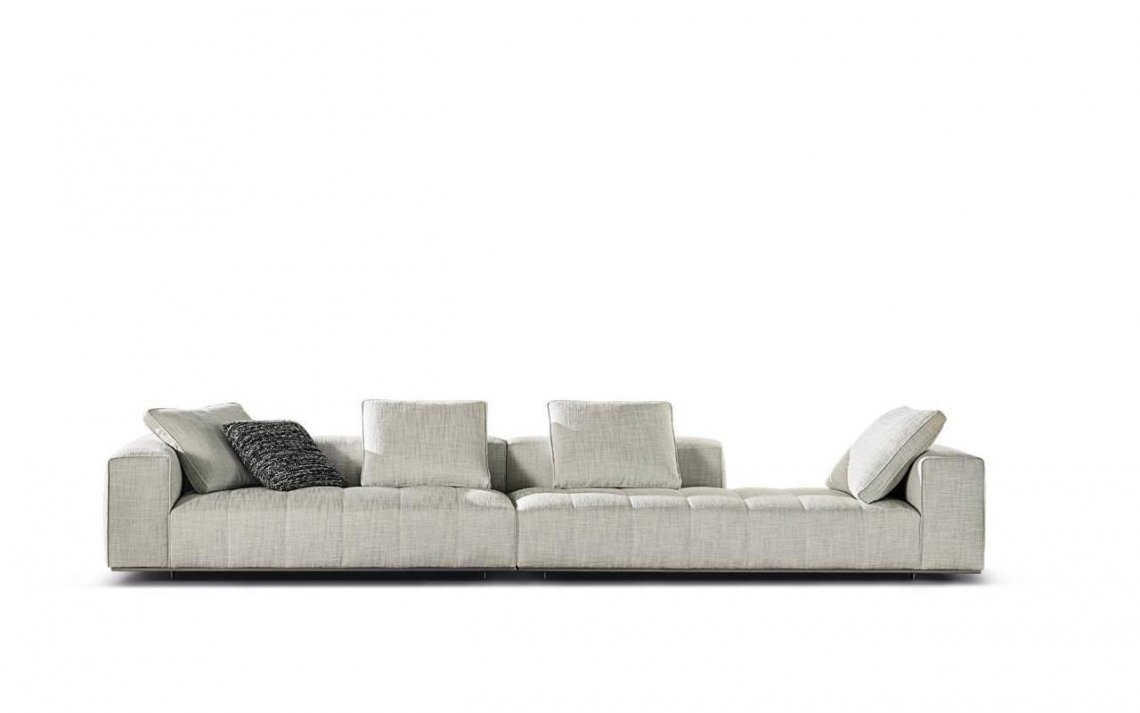 The system is suspended from the floor on refined Bronze or Polished Chrome metal feet, set back from the edge, and a perimeter frame that matches the same finishes; the optical effect of suspension in Goodman enhances the softness of the seat, offering a super-comfortable welcome. The volume of the one-piece seat is particularly ergonomic and comfortable thanks to the use of the innovative technology used: the system of pocket springs is combined with a layer of polyurethane padding in layered densities that give a consistent sensation of softness and cosiness.