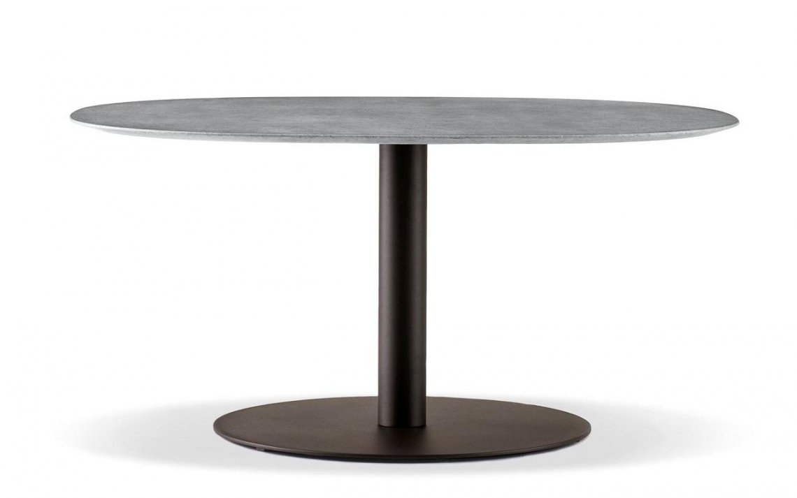 The contoured and fine-grain polished Basaltine stone version undergoes a unique stain-resistant treatment and has a stainless steel base with a polished Pewter, matt Ecru or matt Dark Brown epoxy paint varnish that guarantees colour stability over time. The variant with a teak top in a natural finish has a structural stainless steel frame, varnished matt Ecru or Dark Brown colour to match the finish of the base.