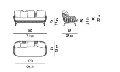 The seats rest on a matt varnished aluminium base, in the shades of Ecru and Dark Brown, reiterating the colours of the cord, and feature padded cushions with extra-durable polyurethane foam inserts, covered in water-repellent fibre and fabric.