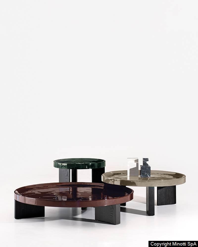 A light and refined coffee table that finds its expressive power in the masterful use of lacquer, Louver features legs in solid Liquorice-coloured ash supporting a flared top that appears to rest delicately on top, as if it were a tray. Designed in three different heights with three different diameters for the top, it is also available in an oval version.