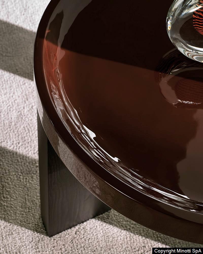 The nuances of the top reinterpret the Seventies vibe with a surface effect that moves the lacquer, making it not only shiny but also strongly textured. The combination of rational shapes and the discreet decoration of the top make it an unexpected coffee table, rendered elegant also thanks to its polished wood legs. Of all the coffee tables in the collection, it is the one with the most decorative inspiration, but always calibrated with a modernist taste, imbued by the combination of the thickness of the entire perimeter of the top and its surface.