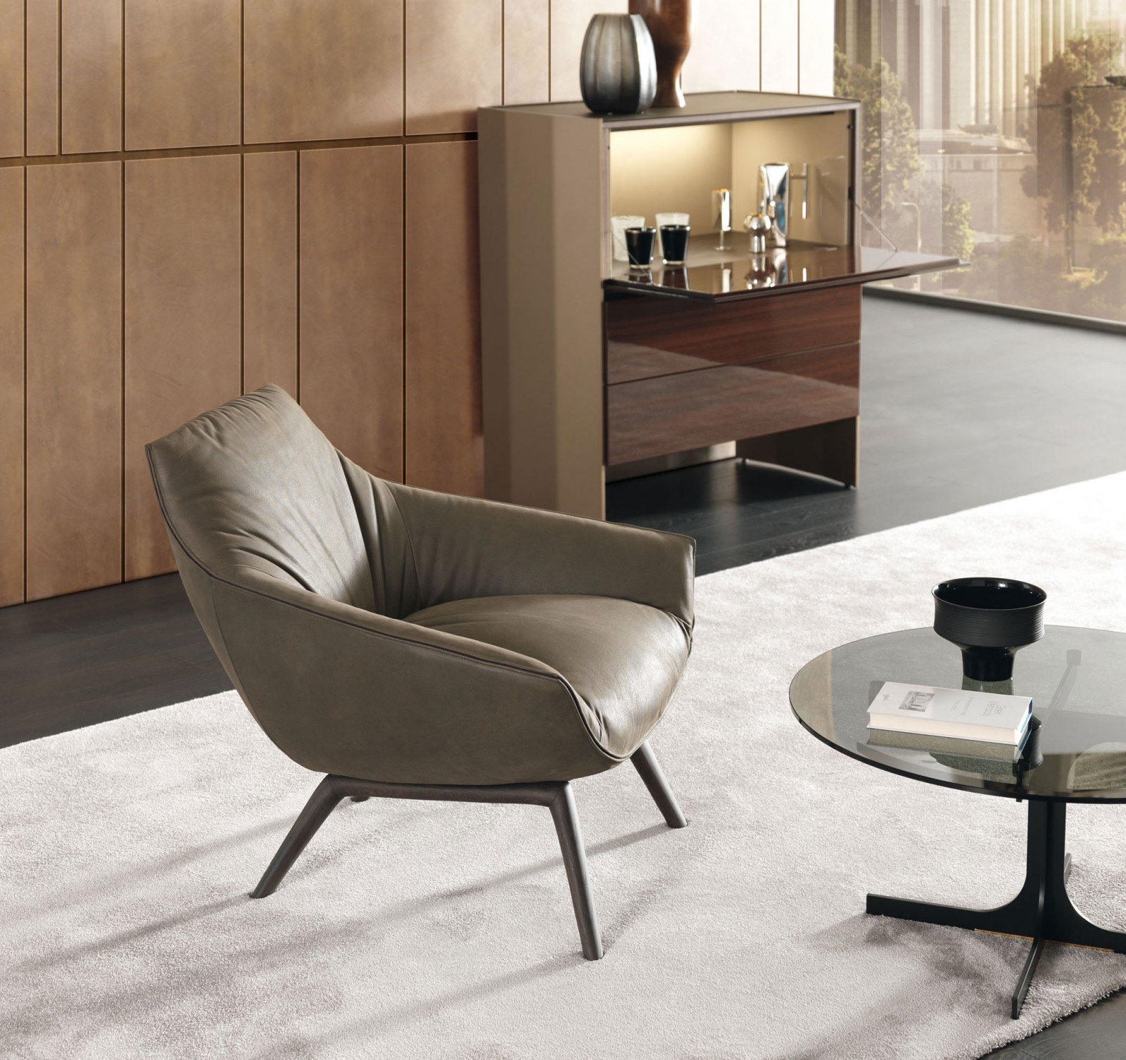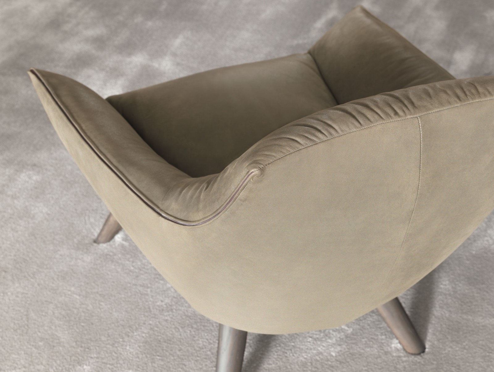The base of the Florentia armchair enlivens the juxtaposition of the rigorously designed legs with