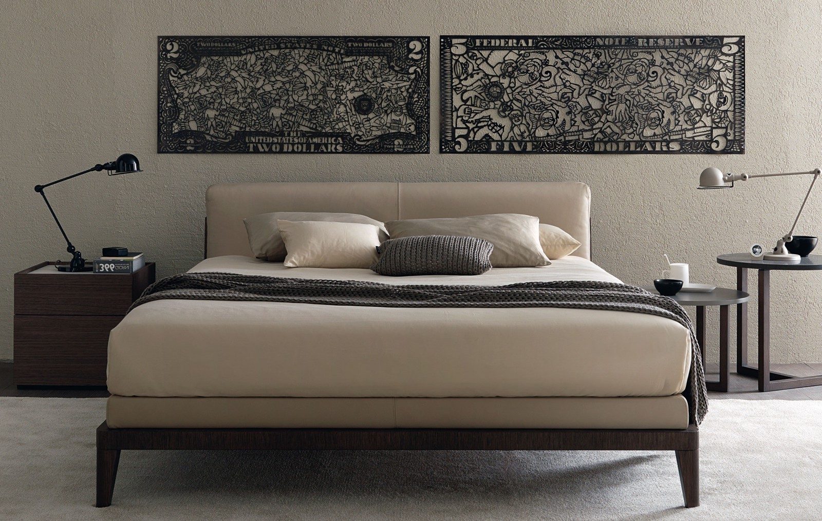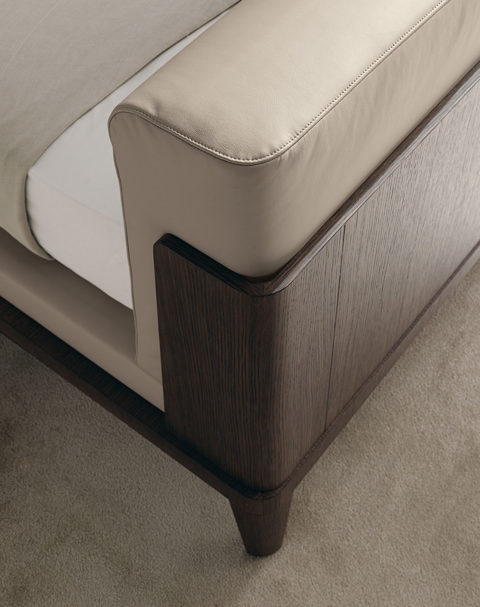 堅固的木質底座,視覺上被極為流線的床頭板和撐腳所柔化,形成完美比例。