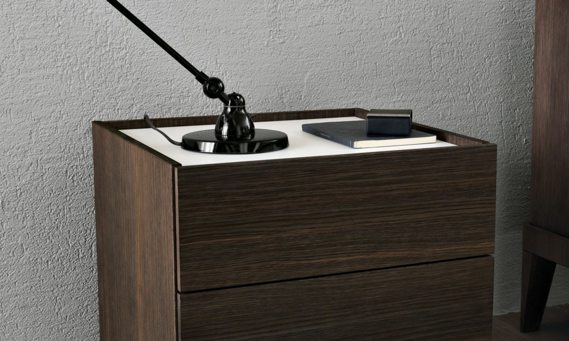 各式各樣的抽屜柜和床頭柜,巧妙與木材、漆器和玻璃結合。頂部弱化了繁瑣的結構