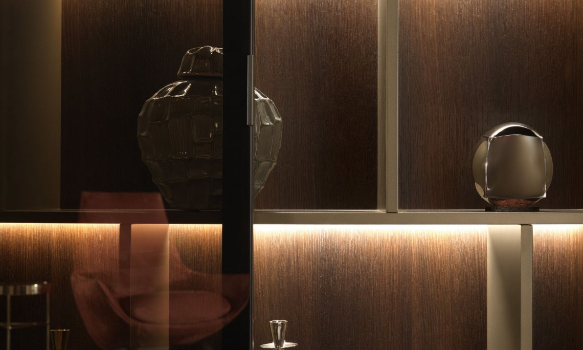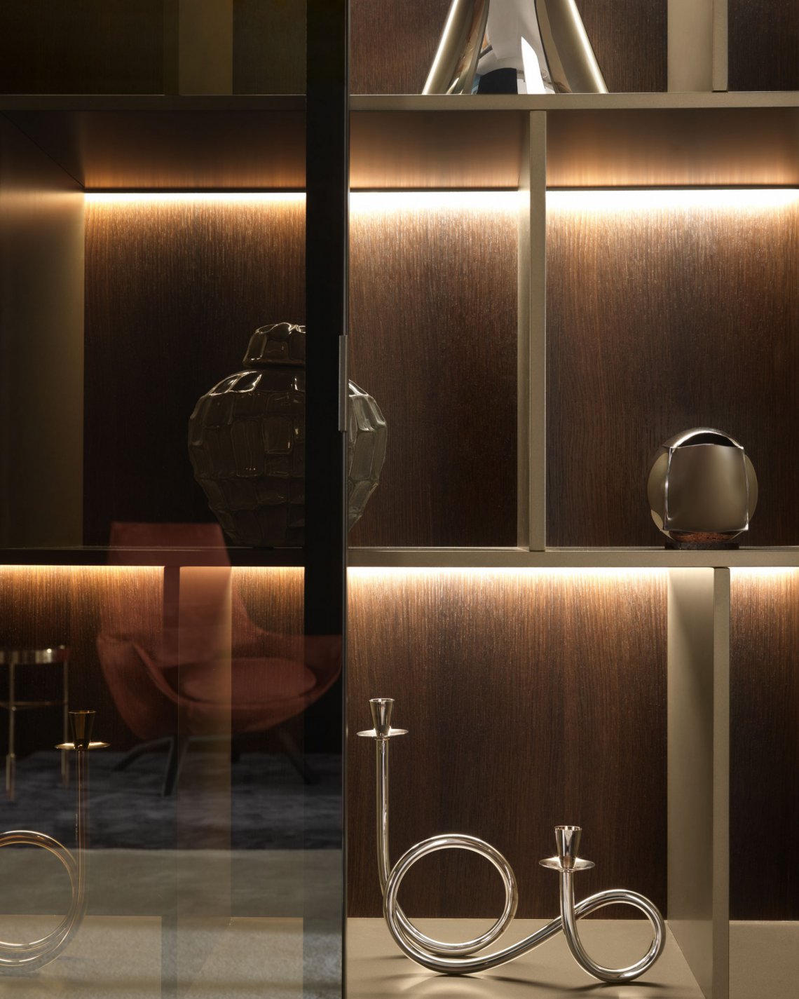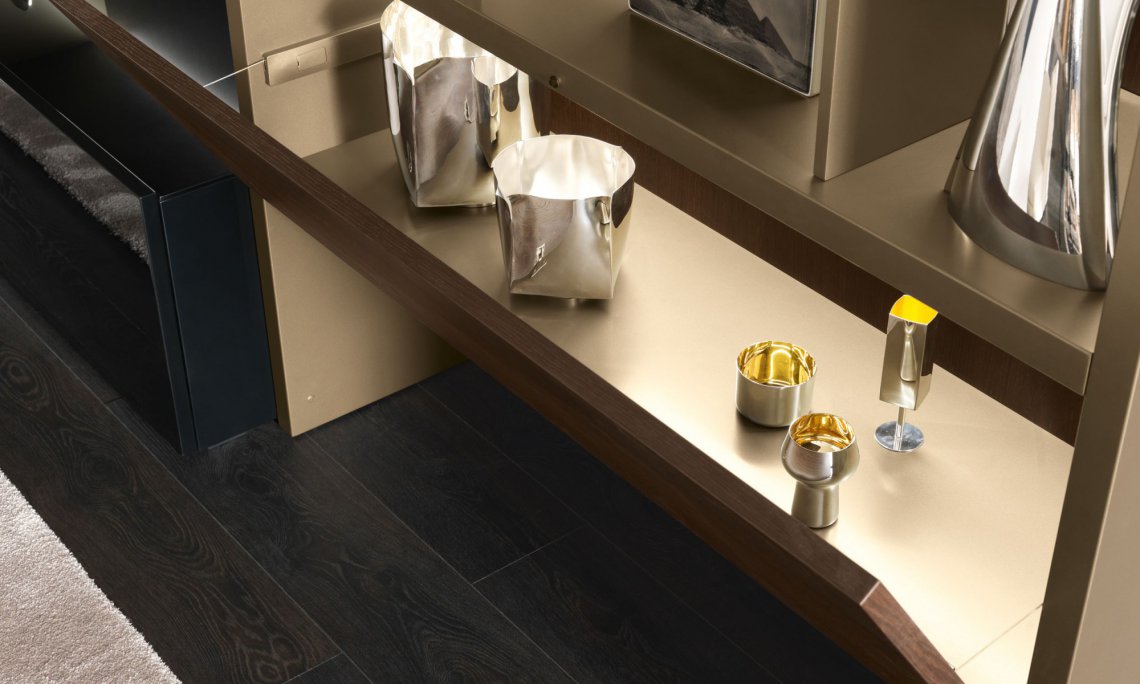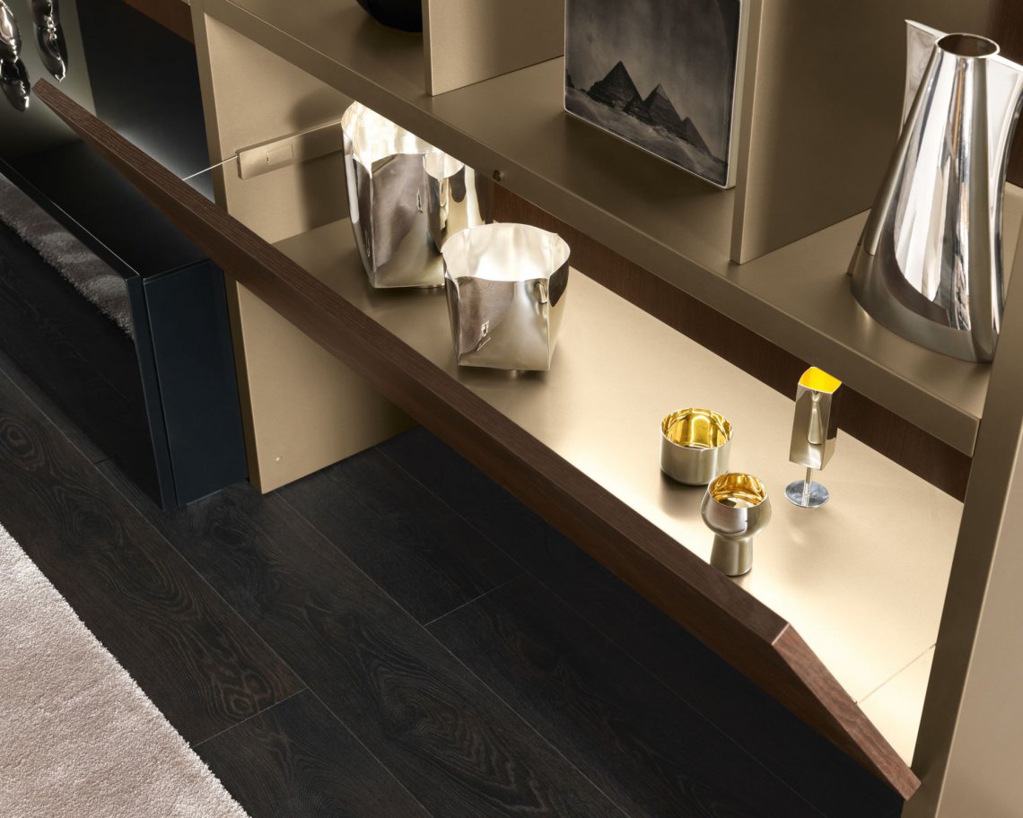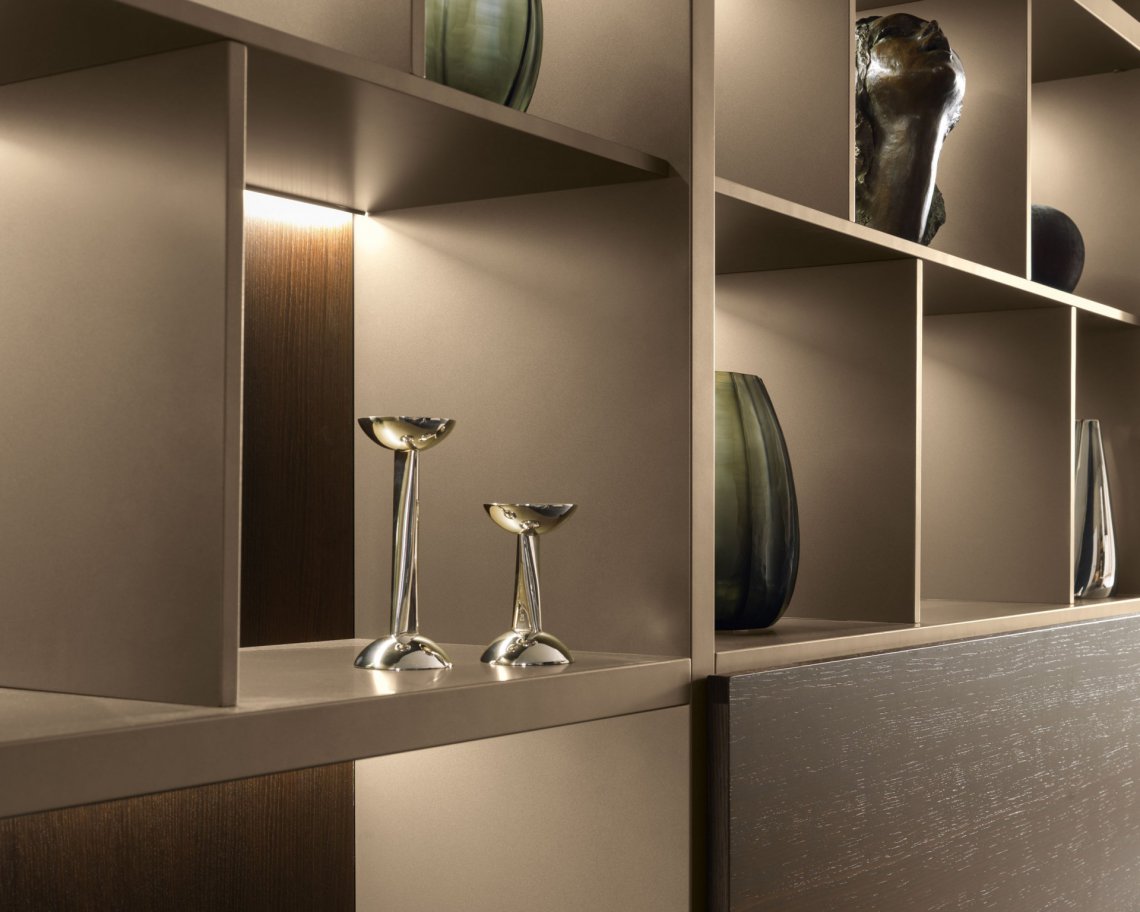 Crossing墻體系列巧妙融合多種不同的潮流元素,包含交替的層架,帶上、下翻門及三維立體玻璃門的吊柜,呈現通透明亮的視覺效果。柜體內部配置定制LED照明系統;鉸鏈門配置阻尼開關系統。集美感與功能設計于一體。真正的創新刷新了書箱的概念。它所組成的嵌板,重量輕,使書柜懸掛起來,賦予了一種全新的“可見明度”的感覺。