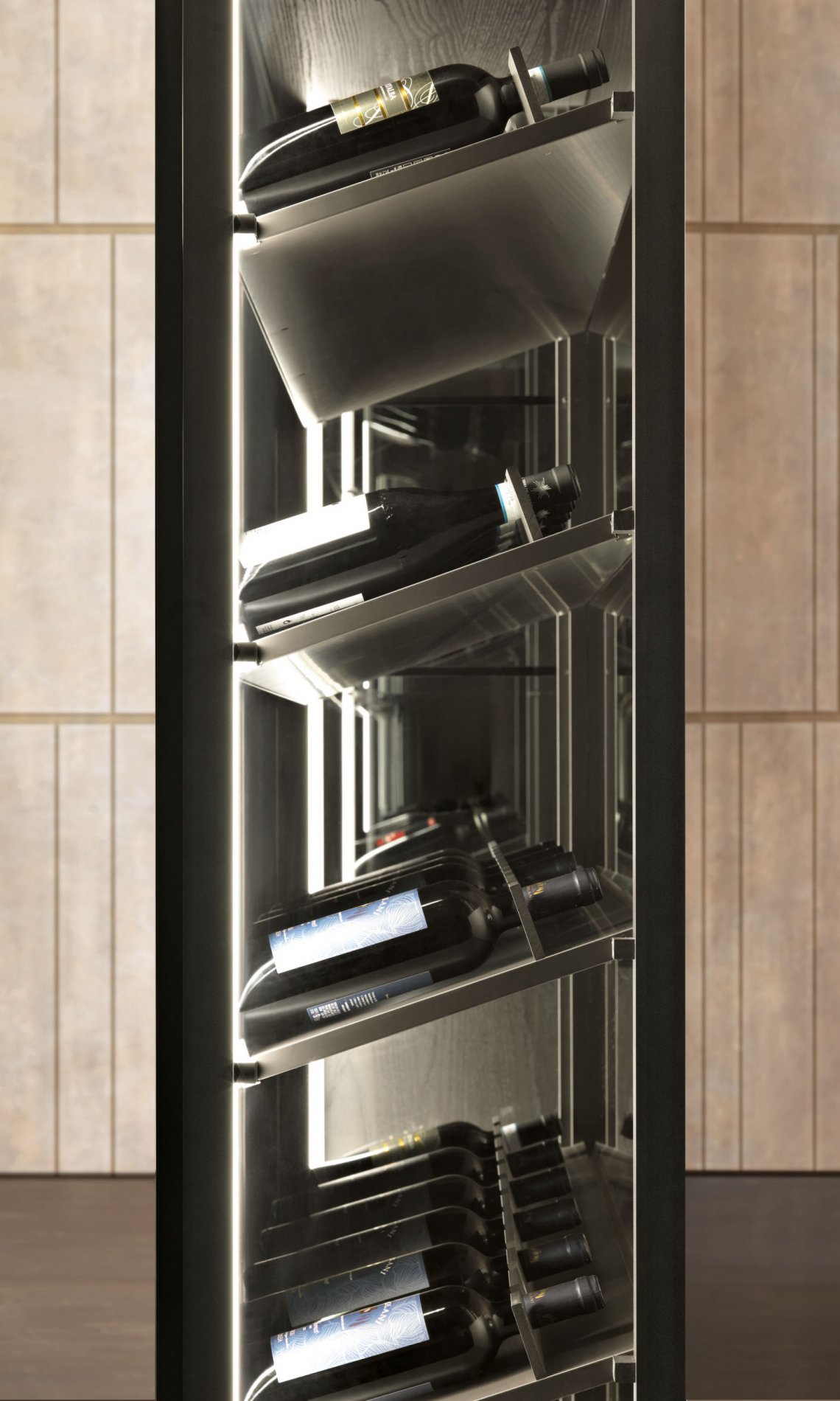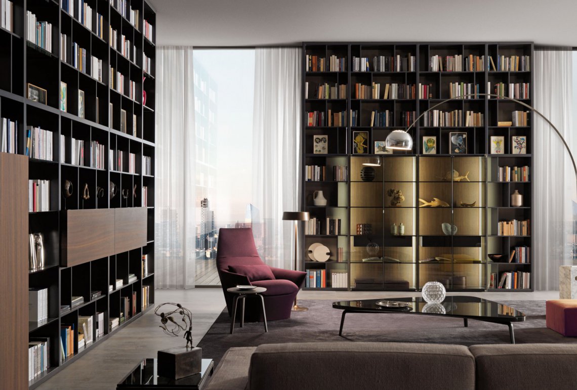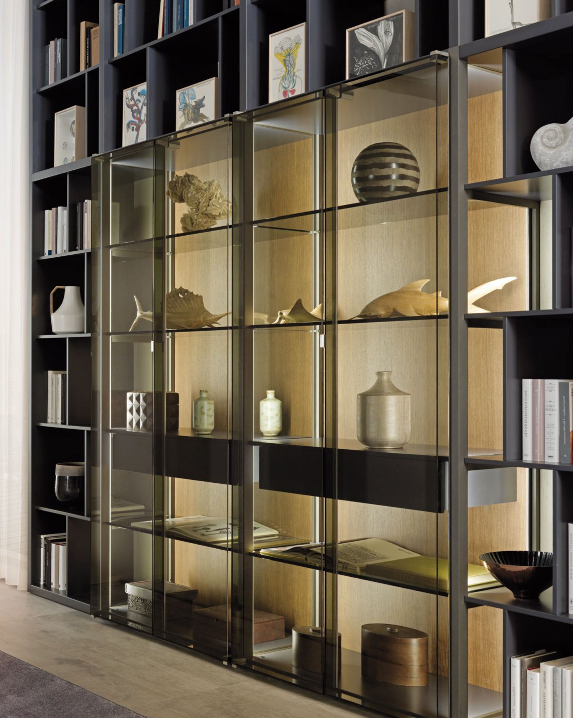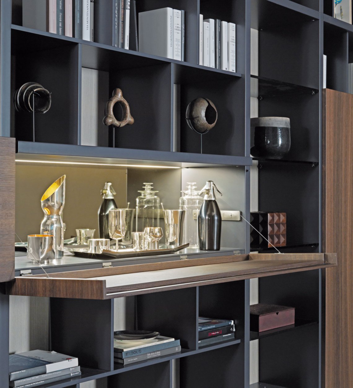 Crossing墻體系列巧妙融合多種不同的潮流元素,包含交替的層架,帶上、下翻門及三維立體玻璃門的吊柜,呈現通透明亮的視覺效果。柜體內部配置定制LED照明系統;鉸鏈門配置阻尼開關系統。集美感與功能設計于一體。真正的創新刷新了書箱的概念。它所組成的嵌板,重量輕,使書柜懸掛起來,賦予了一種全新的“可見明度”的感覺。
