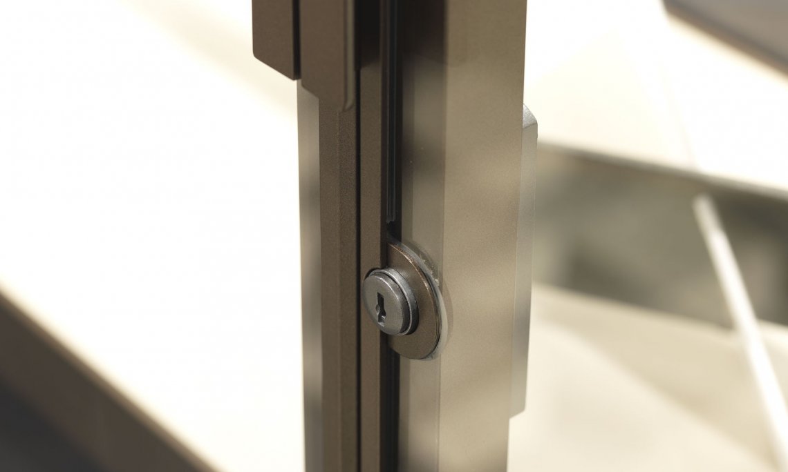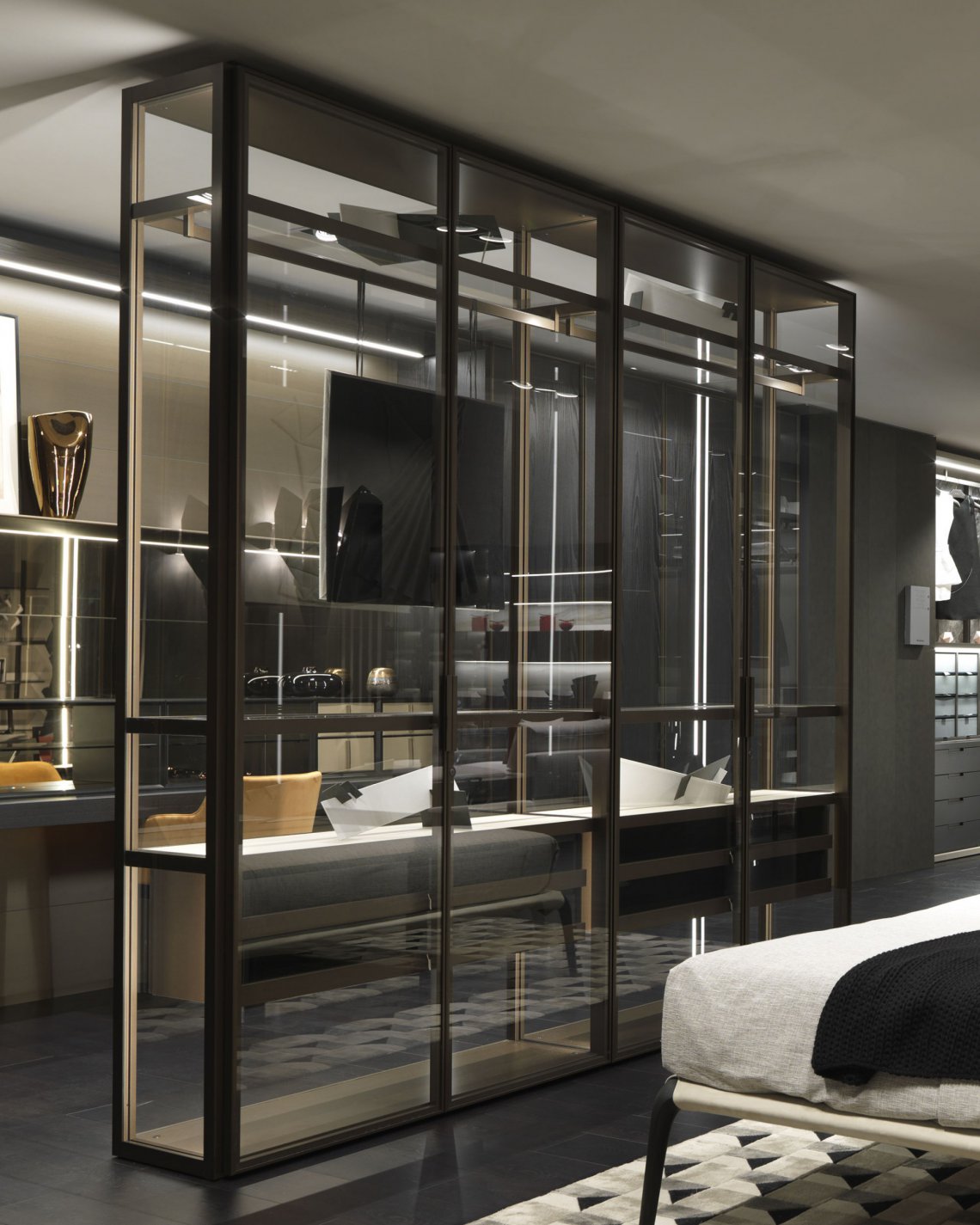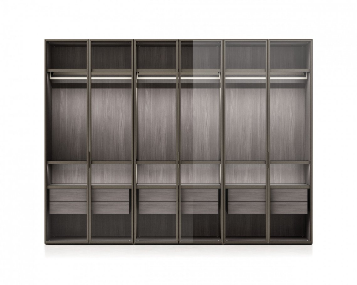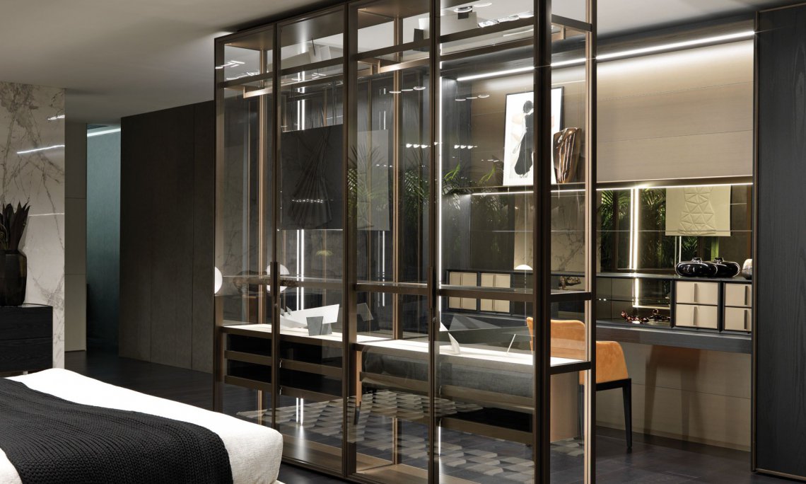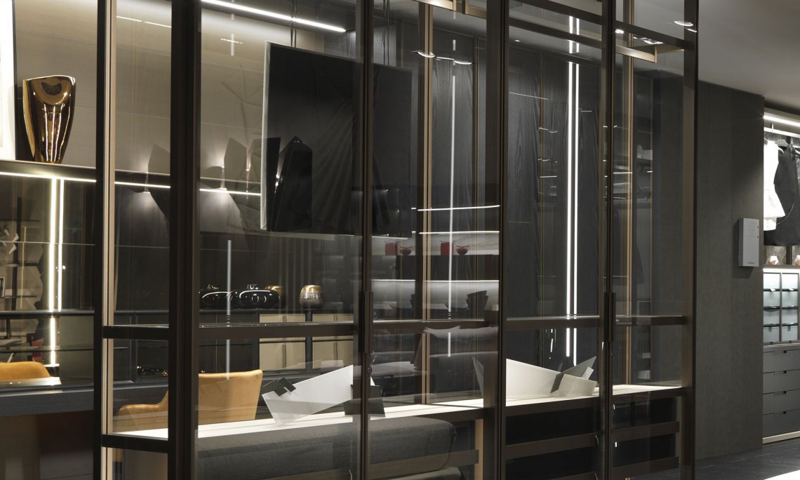 Elegant metallic profiles enhance the dimensional versatility of night systems; combined with the transparency of glass, they lend an extreme formal purity to surfaces. The dedicated handles become part