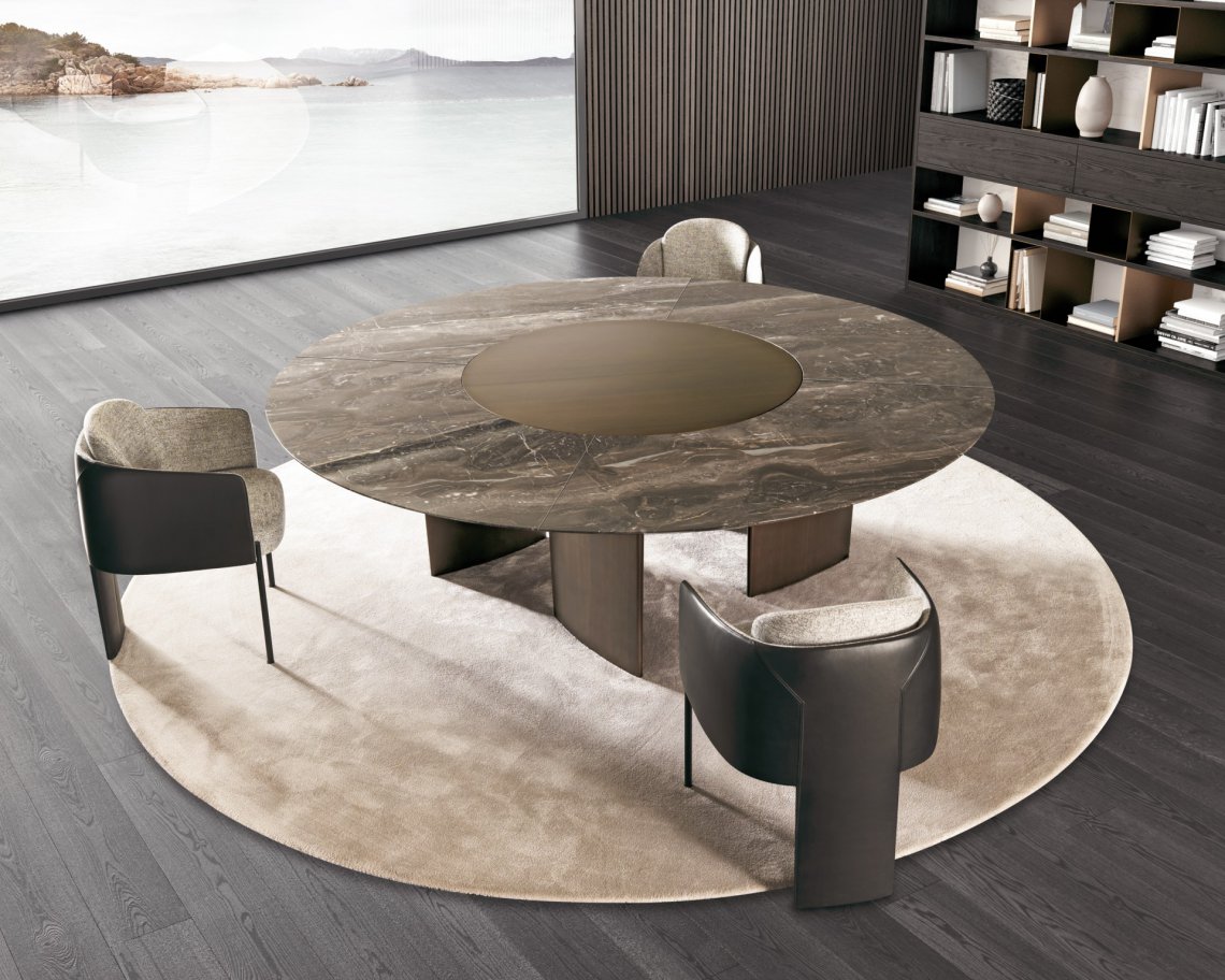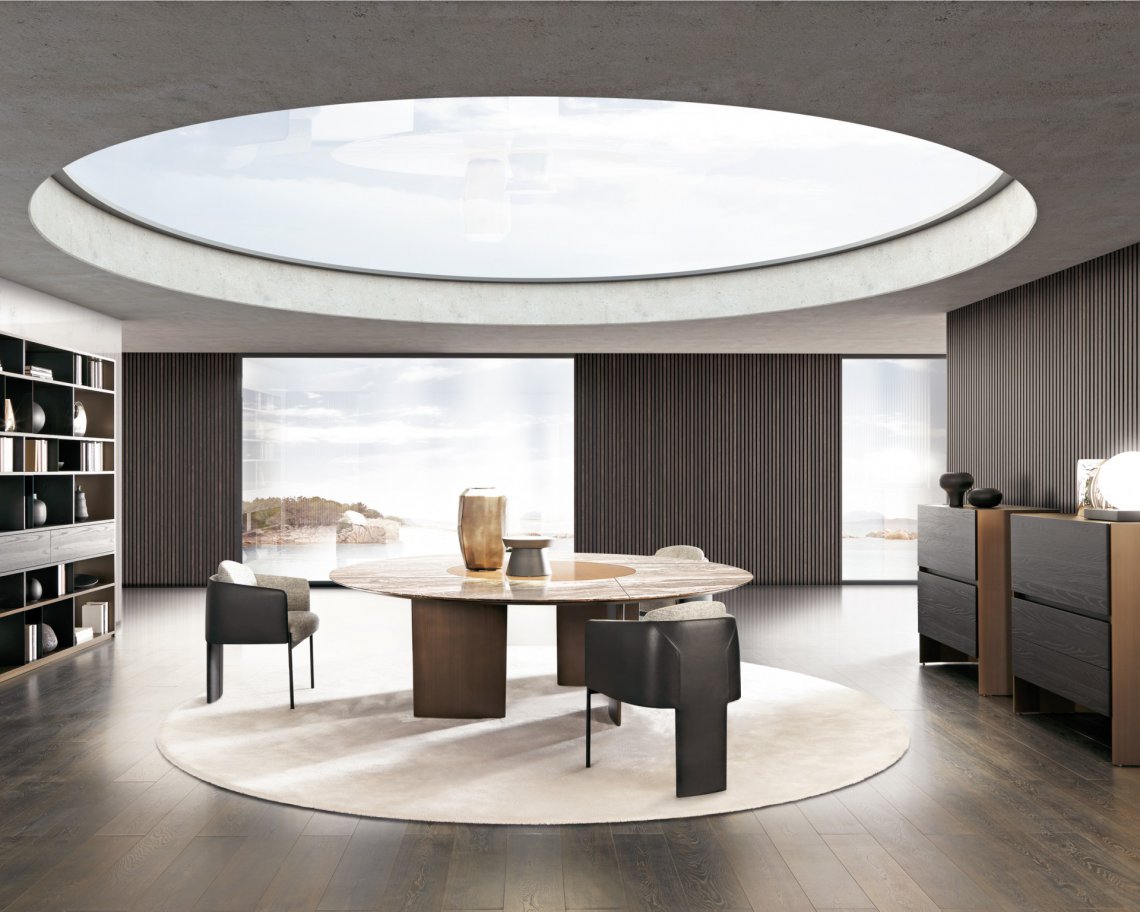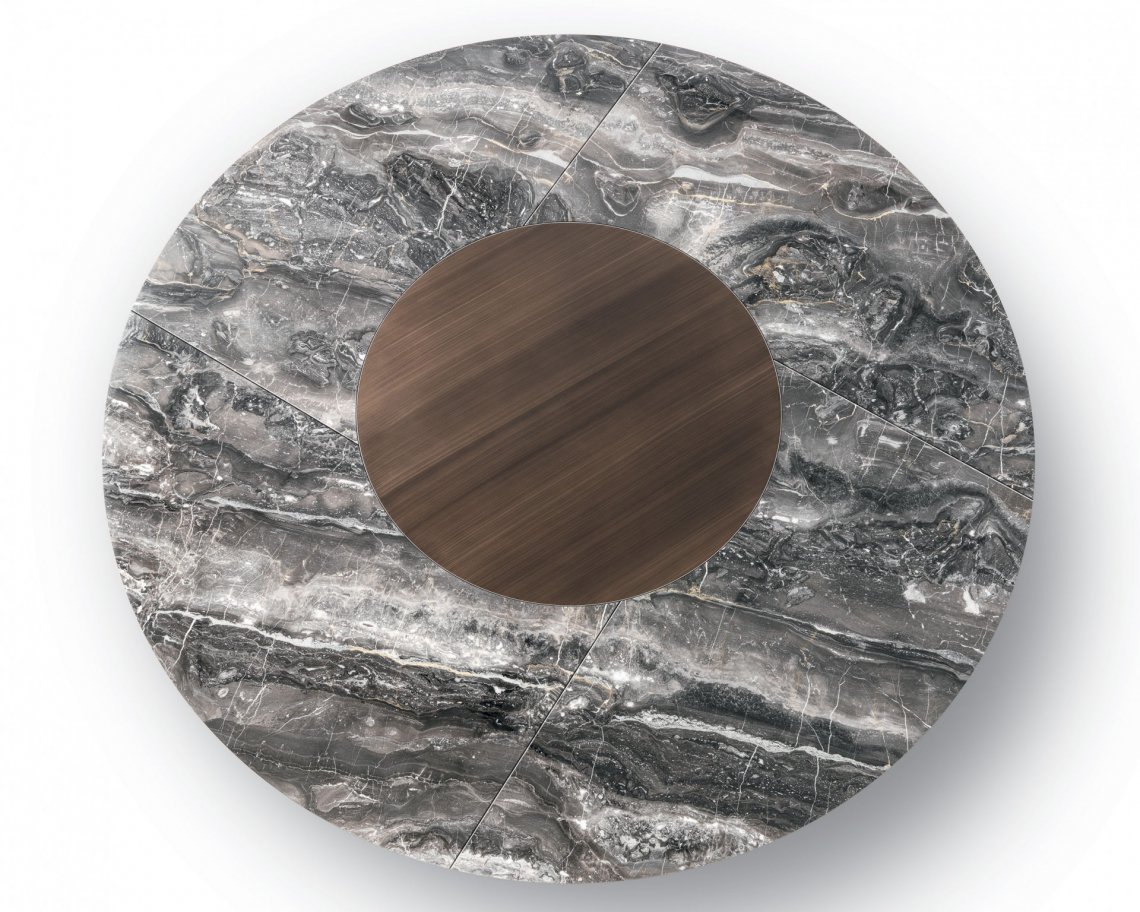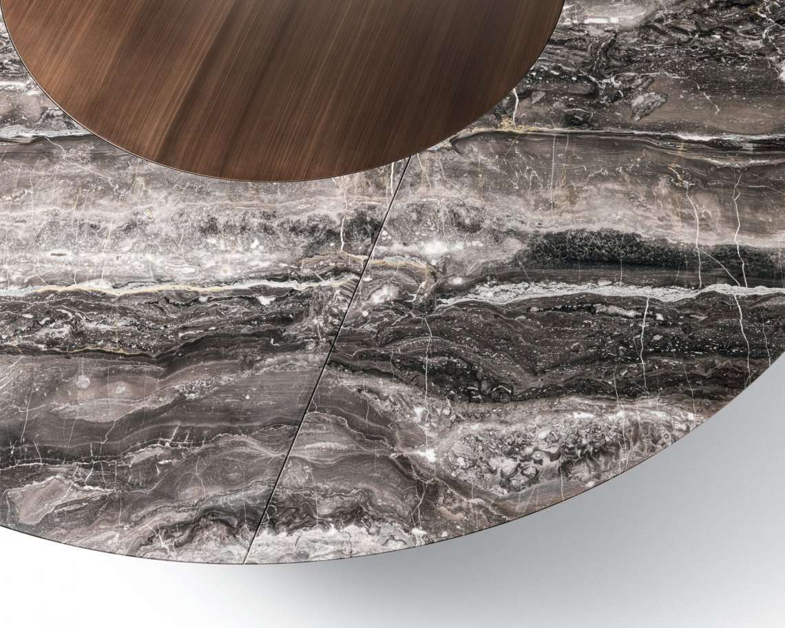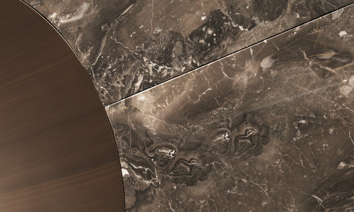 一張桌子,組合不同材料,同時也展示了一種當代科技。桌面的細薄修邊可減輕產品厚度的視覺感知,使其輕巧懸掛。撐腳部分讓人聯想起飛機的機翼,即是這個產品的靈感來源。