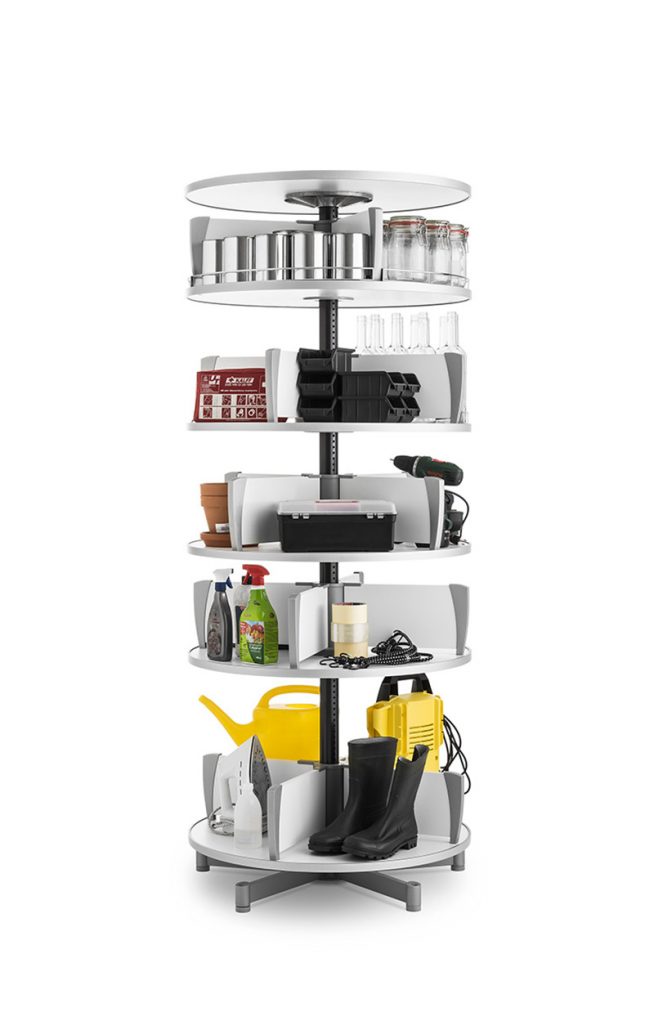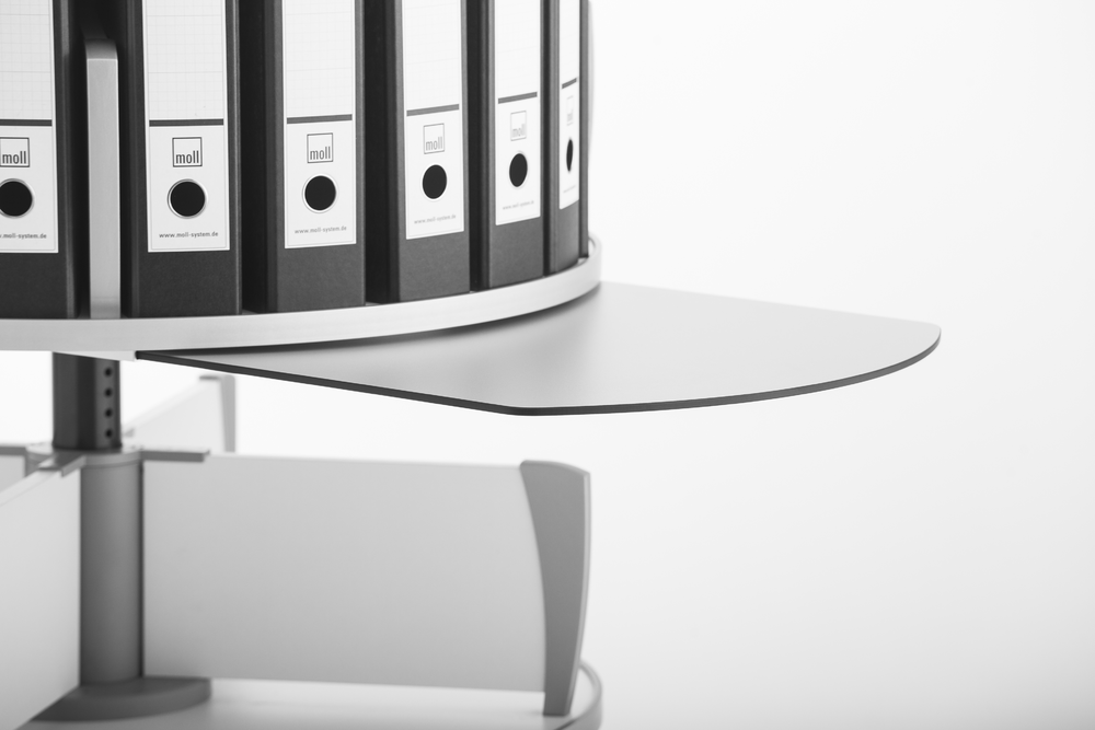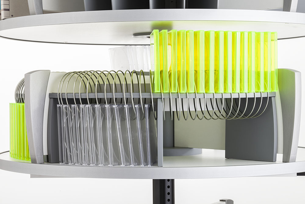 Multifile was developed for efficient storage management and ensures maximum flexibility with effective use of storage space. With a diameter of 80 cm and individually rotatable levels, Multifile also has a wide range of accessories, such as valuable edge profiles and subcompartments.