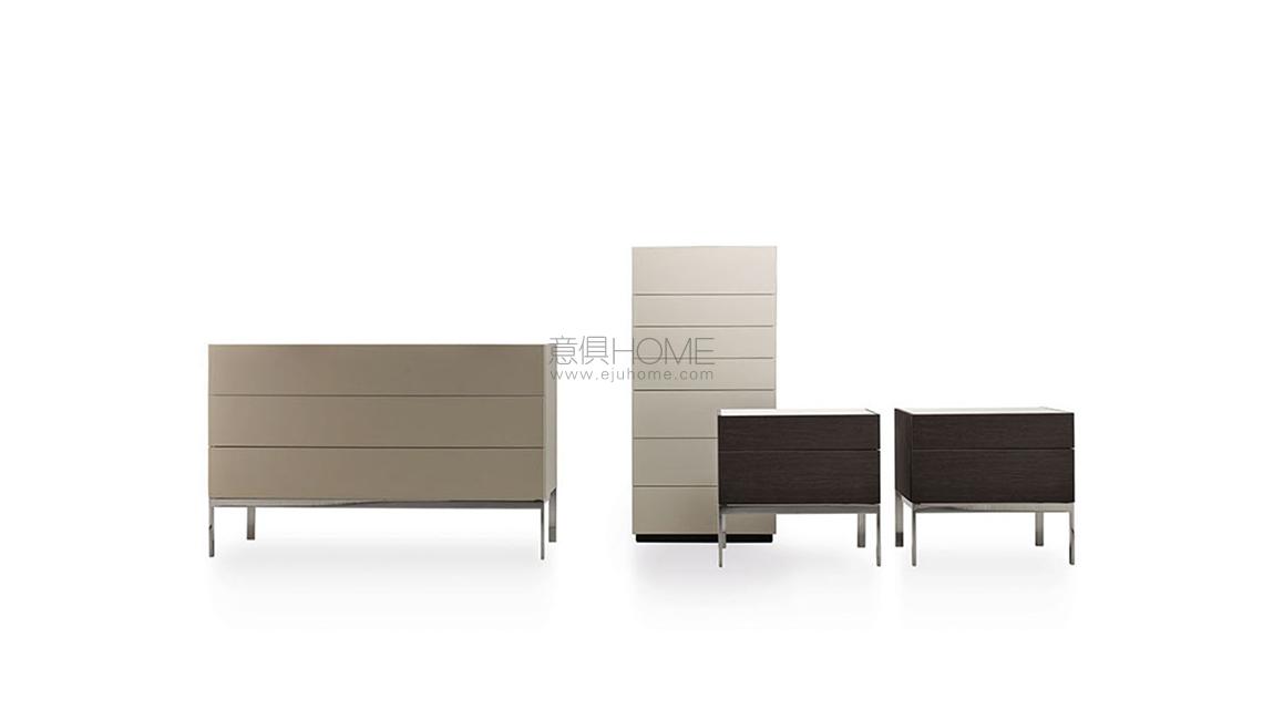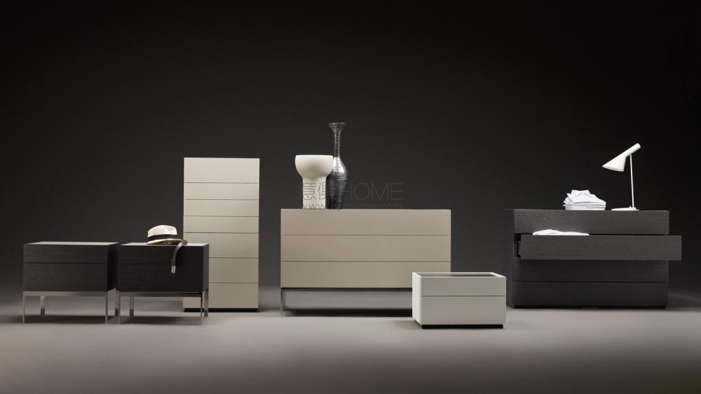 一個設計簡潔而優雅的木制抽屜單元,其特點是材質選擇的多樣性,使其成為一個適應各種家居環境的多樣化產品。一個大的木材存儲單元家族,特點是側面嵌入條和磨砂玻璃頂板的顏色,允許客戶自由選擇以實現框架和抽屜之間的差異化反差,或者選擇同色搭配。兩個型號可選:傳統的落地方式和帶讓抽屜顯得修長的金屬底座。