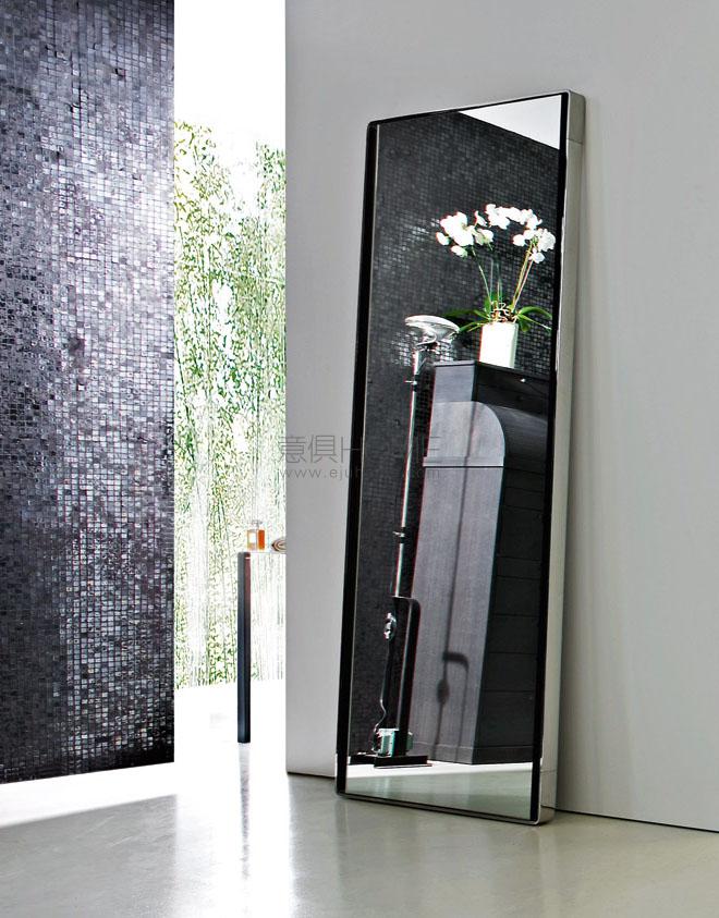 Domino鏡子放置在地板上,四周為亮光鍍鉻金屬邊框,中間是鍍銀玻璃。
