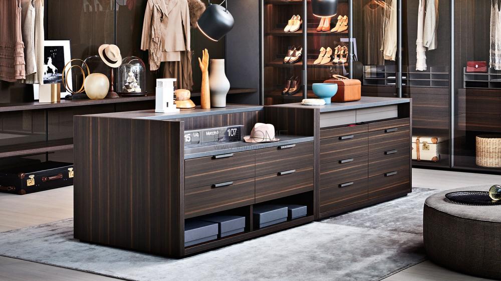 Gliss Master中島是一個(gè)居中放置的獨(dú)立單元,落地?cái)[放,使一個(gè)步入式衣帽間或者封閉區(qū)域的衣柜空間更加完整。儲(chǔ)物格盤,透明玻璃面板抽屜,優(yōu)雅的生態(tài)皮革層板都是其特色元素之一。