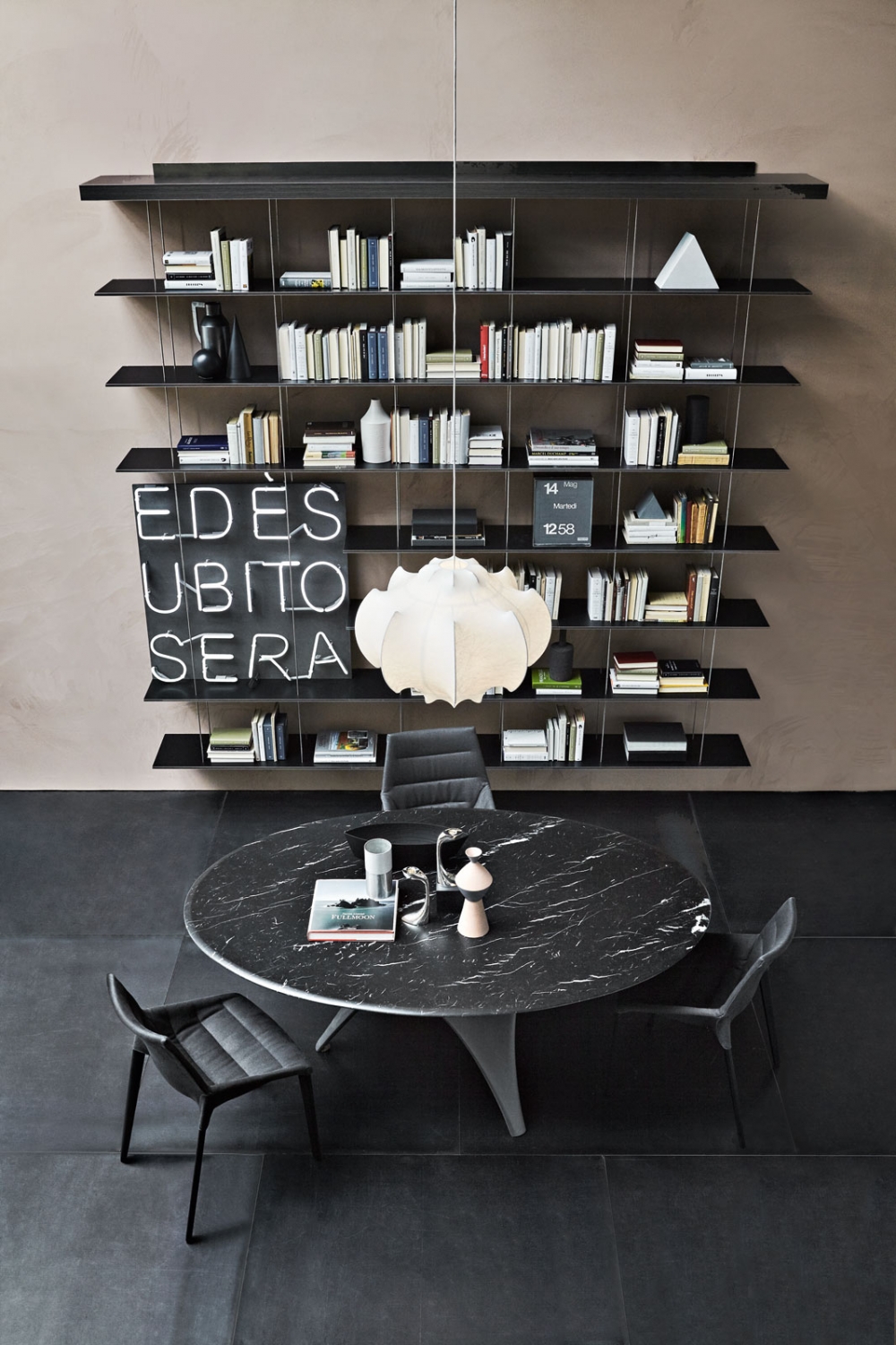 Jean Nouvel通過把單獨(dú)的層板錨定在墻上或者天花板上設(shè)計(jì)了這一令人贊嘆的掛墻結(jié)構(gòu)。修長的鋼結(jié)構(gòu)支撐了可調(diào)節(jié)的層板,實(shí)現(xiàn)了視覺上的懸浮效果,秘訣在于其隱藏的支撐裝置。通透的空間感和透明度。修長的鋼結(jié)構(gòu)支撐了可調(diào)節(jié)的層架,似乎神奇地懸浮在空中,歸功于隱藏的支撐裝置。