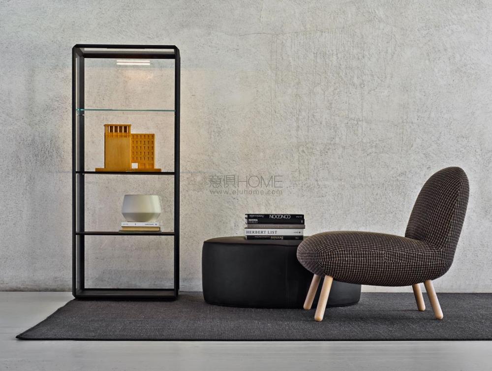 一個設計用來展示和儲藏珍貴物品和書籍的展示柜。呈現出一個透明的固體形狀,引人注目。通過層板的旋轉和傾斜,從傳統的90°角平滑過渡到45°邊角處理。幾何旋轉表面創造了45°平滑的邊緣,通過獨創的金屬連接件固定鋁制邊框,并用珍貴木皮包裹。開門裝置則完全隱藏,只露出一把側面邊框上的小鑰匙。