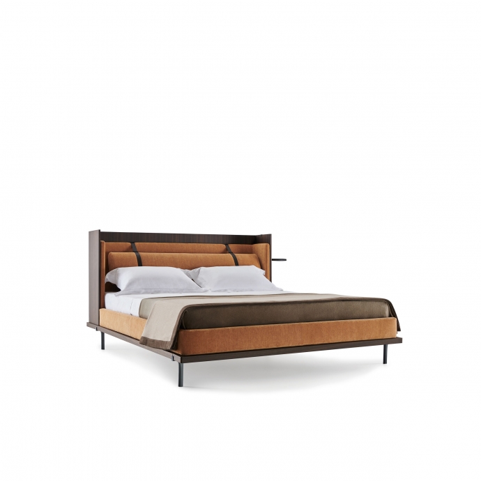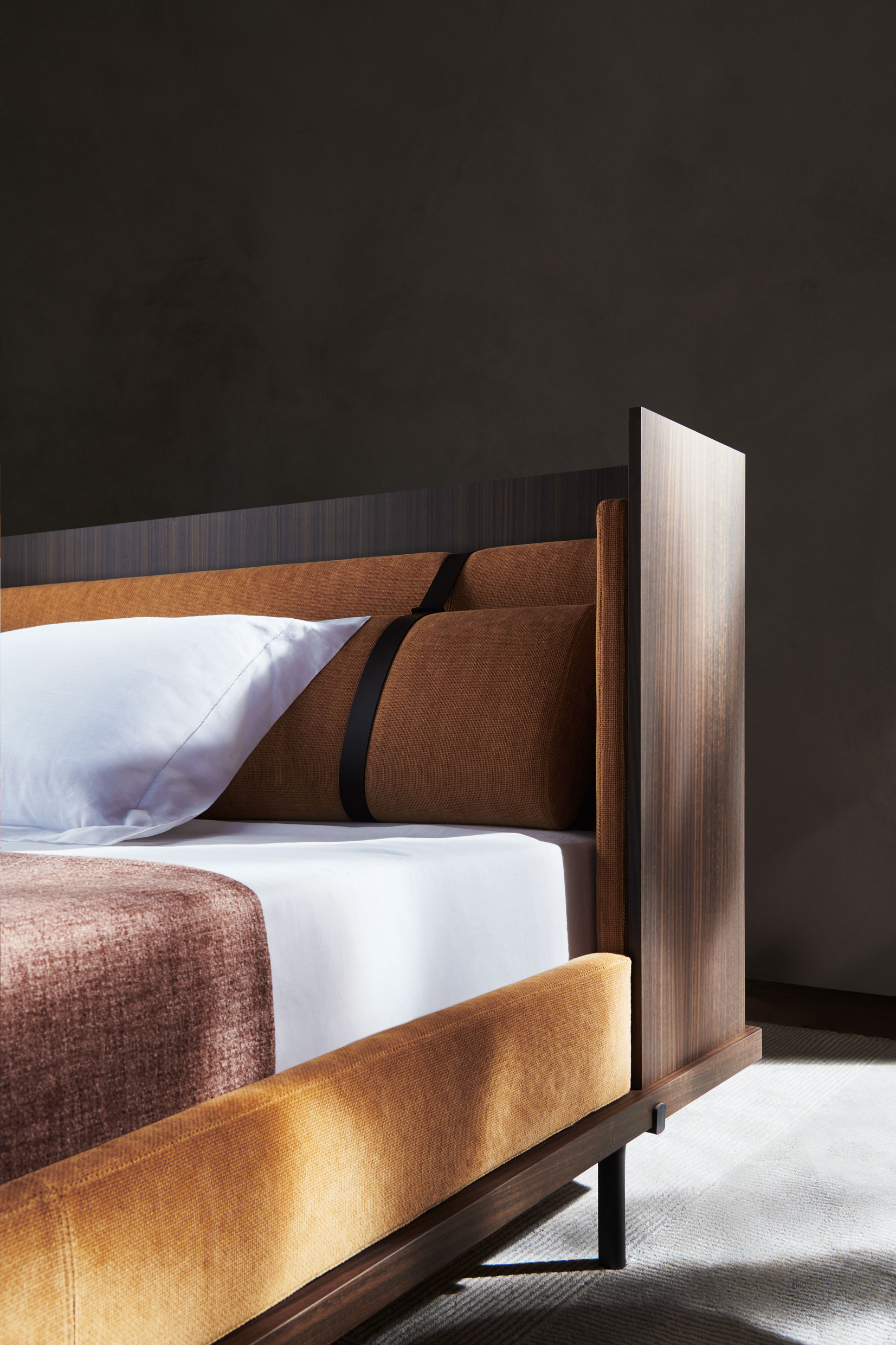 大床有著典型東方的簡潔和簡約特色,木料作為 主要用材,搭配金屬和柔軟的針織面料或皮革。床頭高大且收斂,似乎在擁抱床面。 床頭內側配襯柔軟的針織面料或單色皮革,支撐中間舒適的靠枕,靠墊可作為頭枕使 用。