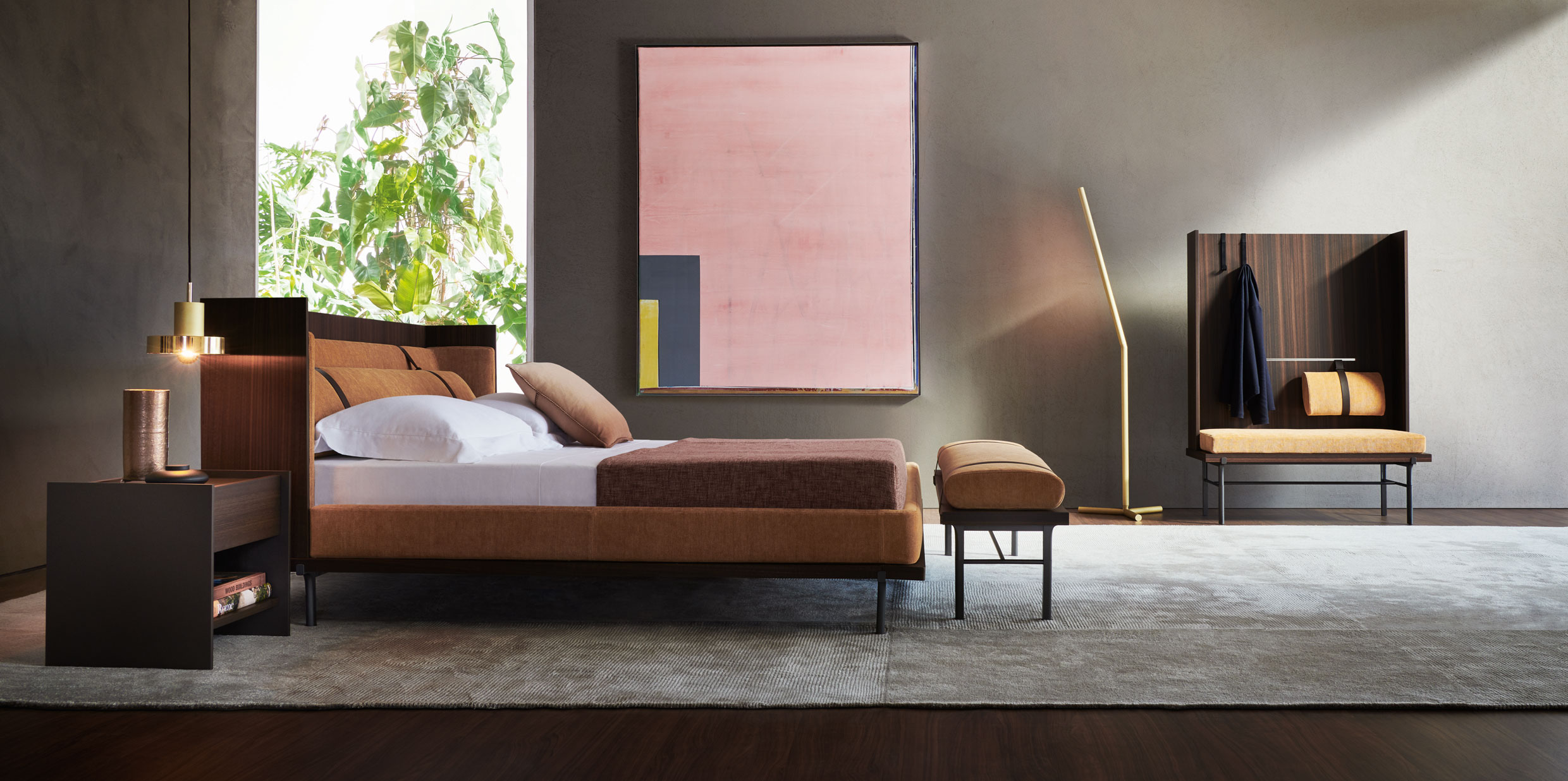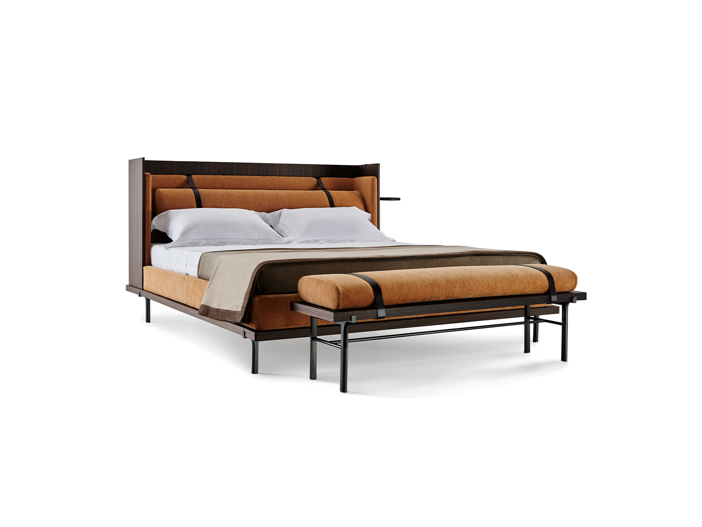 大床的床面為木制,下面由四個纖細的金屬支腿支撐,床面的凹槽軟包皮革或針織面 料,可容納各種類型的床墊。一張舒適的長凳沿用了大床的設計,可以放在床尾,軟墊 像大床一樣通過皮帶固定?;谌缍髟O計研究室的創造力,長凳反過來又變為夢想臥室一件新的配件家具。給長 凳上添加一個類似大床高床頭的元素,就可以成為一處小的私密空間,可以在換衣服 時用來臨時懸掛或放置一些穿著的衣物。此款配件也搭配有舒適的軟墊,其中的靠墊 通過皮帶固定,可以移動,皮帶則插在水平的縫隙之間,為整體增色。