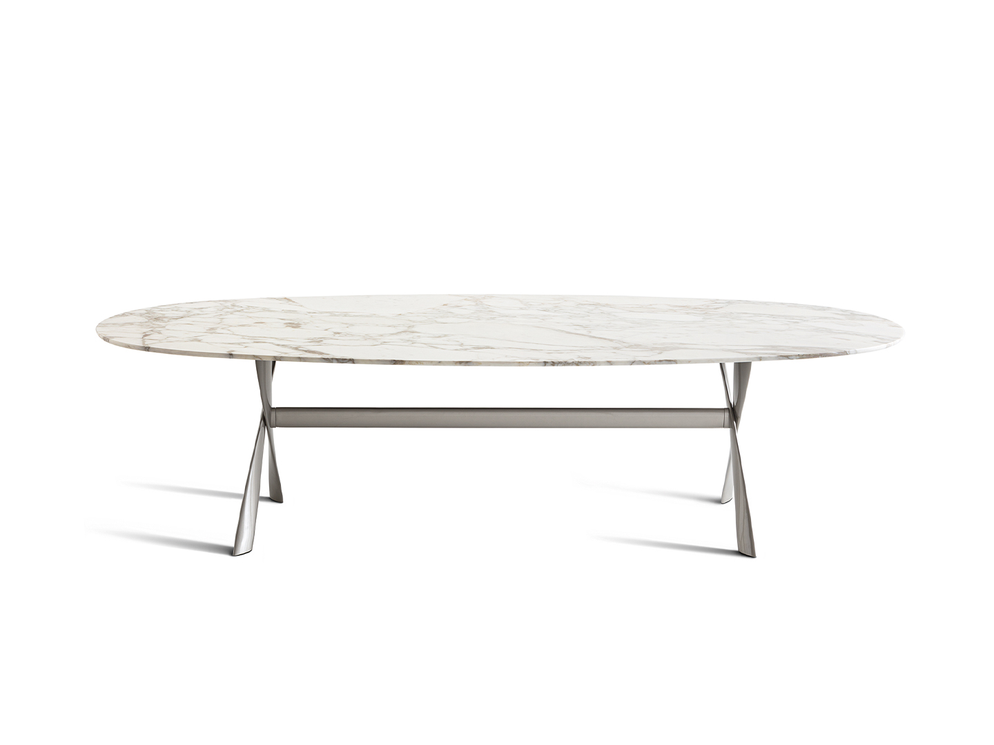 桌子由米蘭建筑師 RODOLFO DORDONI 設(shè)計,取名來自世界上最繁忙的倫敦機場 之一。國際大都市的旅行者們在白天和夜晚的每小時里都會在前往英國首都的機場 樞紐里相遇或是從機場出發(fā),就像人們晚餐時聚在餐桌上一樣。鋁合金扭曲交叉的獨 特結(jié)構(gòu)讓人聯(lián)想到螺旋槳或直升機的槳葉,桌子故此得名。