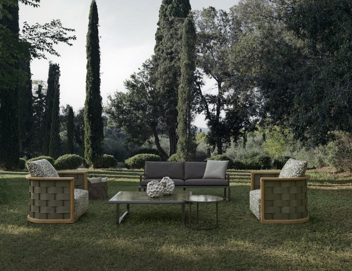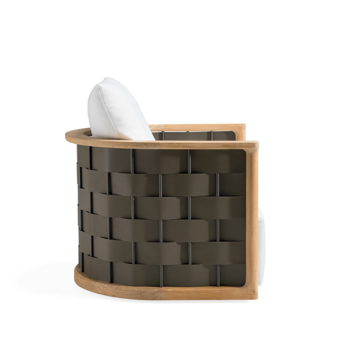 The themes that identify the Landmark Collection - the curved, enveloping lines of the solid teak frame and the macro-scale warp and weft pattern - remain in the armchair and, thanks to the more compact proportions, become even clearer and more expressive.