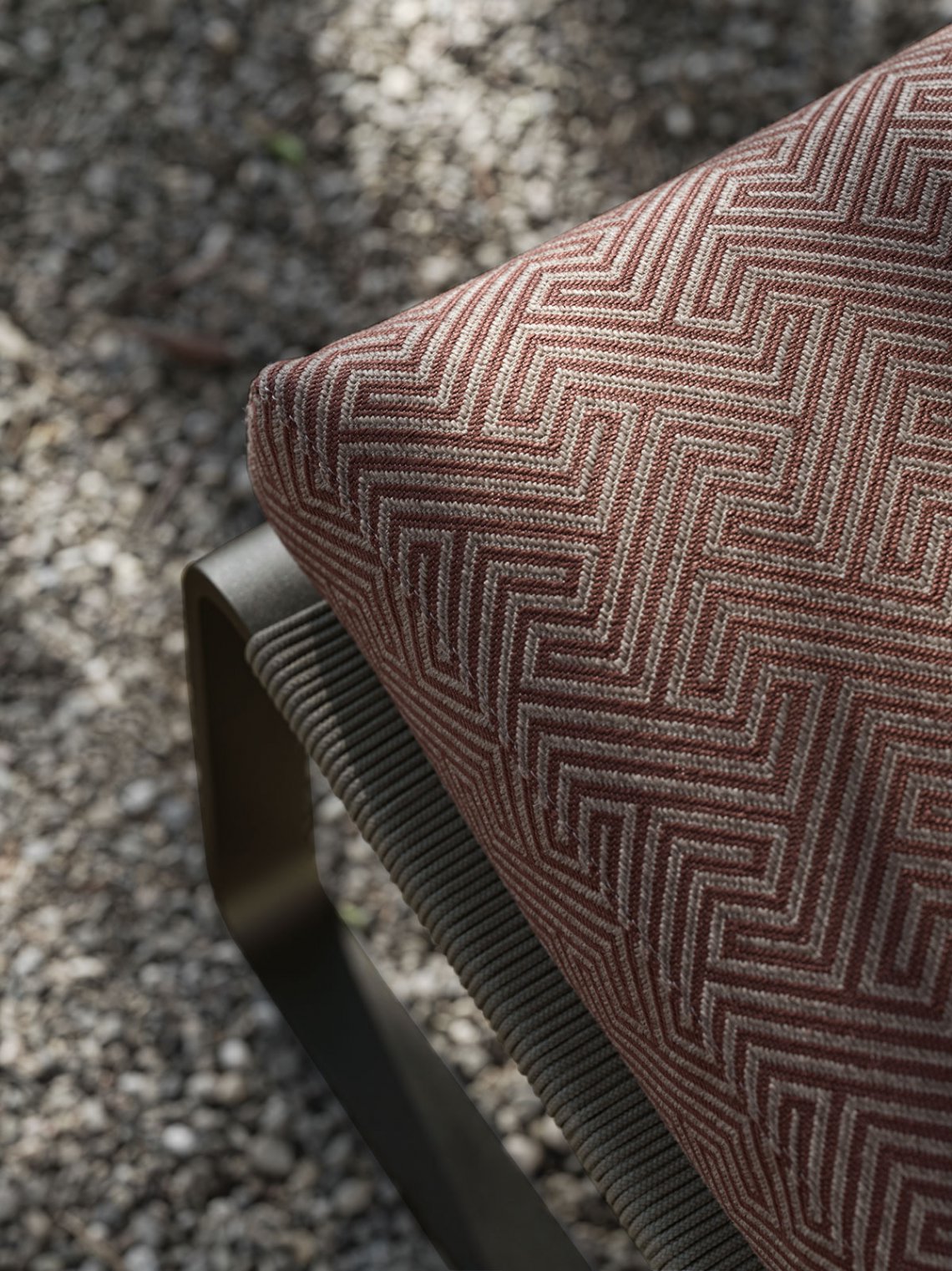 In the seating, the theme of the band of burnished painted aluminium, the fil rouge of the collection, is taken up again in a more leisurely rhythm to create the structure. The bending of the band draws the shape of the backrest and sled bases, with dynamic, agile and angular profiles.