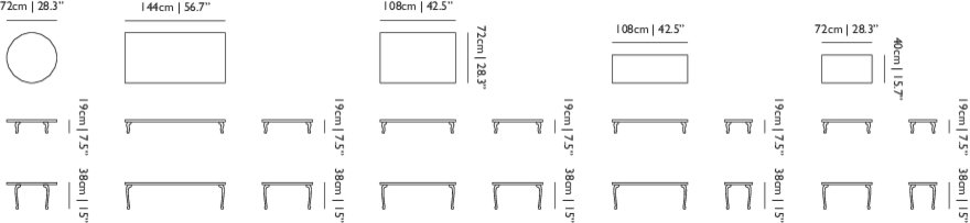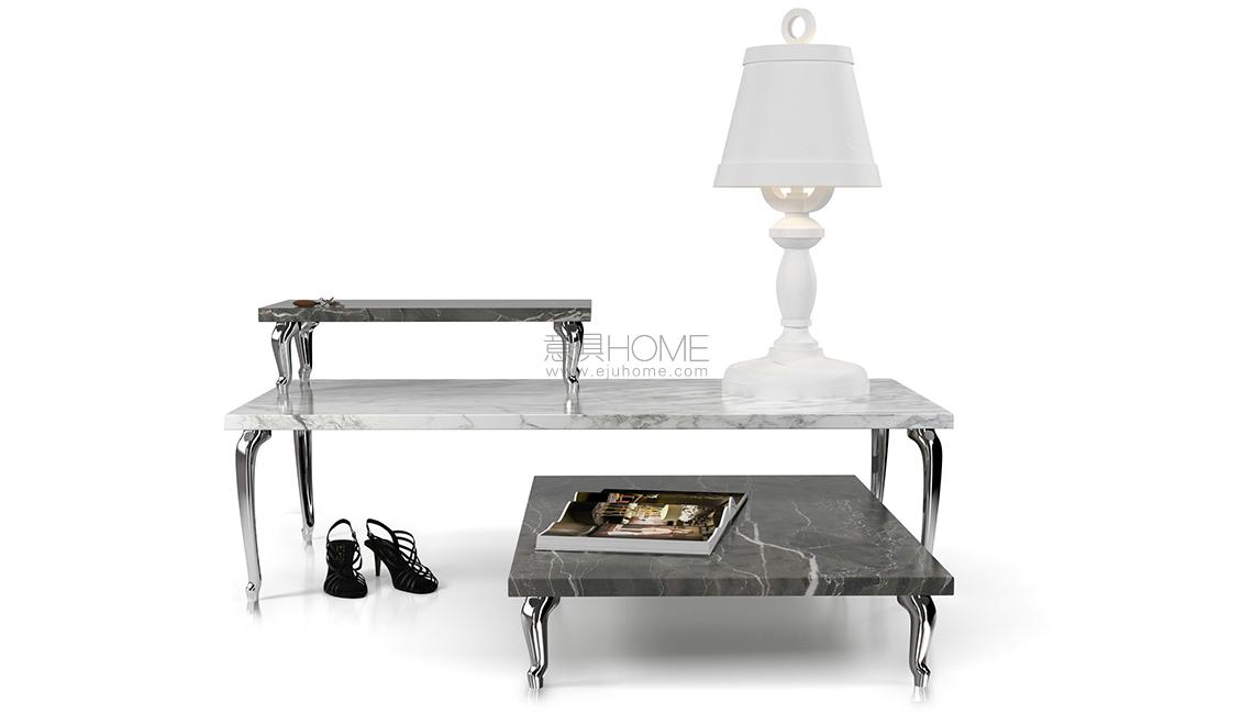 A table for every occasion or a combination of tables placed side by side and onto each other to decorate with elegance, practical sense and a touch of humor. The Bassotti table collection by Marcel Wanders merges the solid grace of marble table tops with the shiny lightness of classically shaped legs.