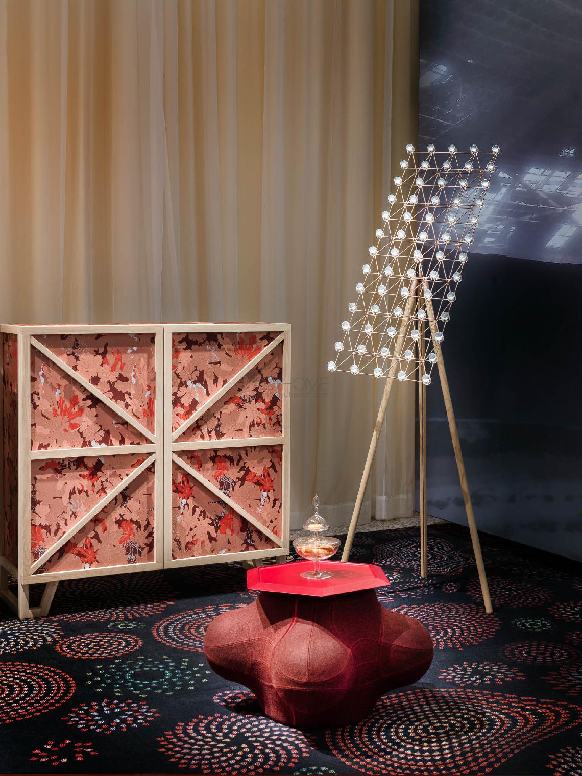 Space-Frame Floor, designed by Marcel Wanders, is a rhythmic geometric net of stainless steel and LED lights with shades like crystal lamps. Its wonderful surface can rotate and move with the flowing lightness of a satellite. An oak frame supports the frame.